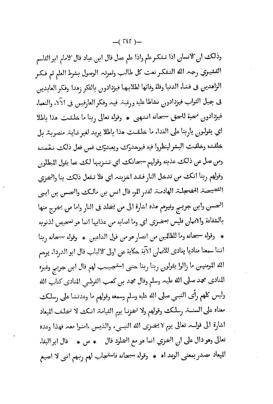 وذلك أن الإنسان إذا تفكر علم وإذا علم عمل قال ابن عباد قال الإمام أبو القاسم القشيري رحمه الله التفكر نعت كل طالب وثمرته الوصول بشرط العلم ثم فكر الزاهدين في فناء الدنيا وقلة وفائها لطلابها فيزدادون بالفكر زهدا وفكر العابدين في جميل الثواب فيزدادون نشاطا عليه ورغبة فيه وفكر العارفين في الآلاء والنعماء فيزدادون محبة للحق سبحانه انتهى وقوله تعالى ربنا ماخلقت هذا باطلا أي يقولون يا ربنا على النداء ما خلقت هذا باطلا يريد لغير غاية منصوبة بل خلقته وخلقت البشر لينظروا فيه فيوحدوك ويعبدوك فمن فعل ذلك نعمته ومن ضل عن ذلك عذبته وقولهم سبحانك أي تنزيها لك عما يقول المبطلون وقولهم ربنا إنك من تدخل النار فقد أخزيته أي فلا تفعل ذلك بنا والخزي الفضيحة المخجلة الهادمة لقدر المرء قال أنس بن مالك والحسن بن أبي الحسن وابن جريج وغيرهم هذه إشارة إلى من يخلد في النار وأما من يخرج منها بالشفاعة والإيمان فليس بمخزي أي وما أصابه من عذابها إنما هو تمحيص لذنوبه وقوله سبحانه وما للظالمين من أنصار هو من قول الداعين وقوله سبحانه ربنا إننا سمعنا مناديا ينادي للإيمان الآية حكاية عن أولى الألباب قال أبو الدرداء يرحم الله المؤمنين ما زالوا يقولون ربنا ربنا حتى استجيب لهم قال ابن جريج وغيره المنادى محمد صلى الله عليه و سلم وقال محمد بن كعب القرظي المنادى كتاب الله وليس كلهم رأى النبي ص - وسمعه وقولهم ما وعدتنا على رسلك معناه على ألسنة رسلك وقولهم ولا تخزنا يوم القيامة إنك لا تخلف المعياد إشارة إلى قوله تعالى يوم لا يخزي الله النبيء والذين ءامنوا معه فهذا وعده تعالى وهو دال على أن الخزي إنما هو مع الخلود قال ص قال أبو البقاء الميعاد مصدر بمعنى الوعد اه وقوله سبحانه فاستجاب لهم ربهم اني لا أضيع