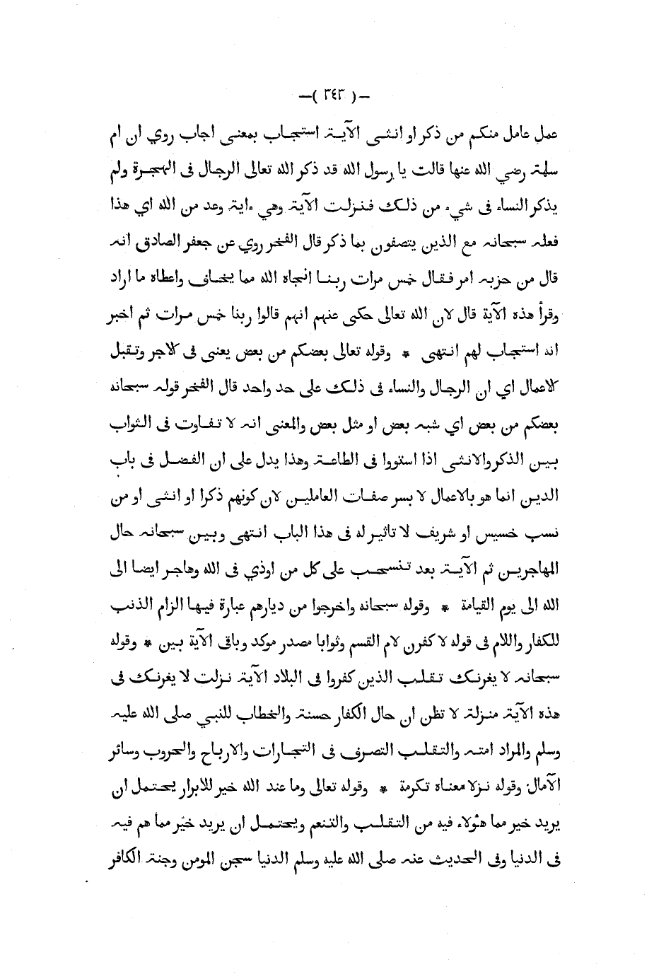 عمل عامل منكم من ذكر أو أنثى الآية استجاب بمعنى أجاب روي أن أم سلمة رضي الله عنها قالت يا رسول الله قد ذكر الله تعالى الرجال في الهجرة ولم يذكر النساء في شيء من ذلك فنزلت الآية وهي آية وعد من الله أي هذا فعله سبحانه مع الذين يتصفون بما ذكر قال الفخر روي عن جعفر الصادق أنه قال من حزبه أمر فقال خمس مرات ربنا أنجاه الله مما يخاف وأعطاه ما أراد وقرأ هذه الآية قال لأن الله تعالى حكى عنهم أنهم قالوا ربنا خمس مرات ثم أخبر أنه استجاب لهم انتهى وقوله تعالى بعضكم من بعض يعني في الأجر وتقبل الأعمال أي أن الرجال والنساء في ذلك على حد واحد قال الفخر قوله سبحانه بعضكم من بعض أي شبه بعض أو مثل بعض والمعنى أنه لا تفاوت في الثواب بين الذكر والأنثى إذا استووا في الطاعة وهذا يدل على أن الفضل في باب الدين إنما هو بالأعمال لا بسر صفات العاملين لأن كونهم ذكرا أو أنثى أو من نسب خسيس أو شريف لا تأثير له في هذا الباب انتهى وبين سبحانه حال المهاجرين ثم الآية بعد تنسحب على كل من أوذي في الله وهاجر أيضا إلى الله إلى يوم القيامة وقوله سبحانه وأخرجوا من ديارهم عبارة فيها إلزام الذنب للكفار واللام في قوله لاكفرن لام القسم وثوابا مصدر مؤكد وباقي الآية بين وقوله سبحانه لا يغرنك تقلب الذين كفروا في البلاء الآية نزلت لا يغرنك في هذه الآية منزلة لا تظن أن حال الكفار حسنة والخطاب للنبي صلى الله عليه و سلم والمراد أمته والتقلب التصرف في التجارات والأرباح والحروب وسائر الآمال وقوله نزلا معناه تكرمة وقوله تعالى وما عند الله خير للأبرار يحتمل أن يريد خير مما هؤلاء فيه من التقلب والتنعم ويحتمل أن يريد خير مما هم فيه في الدنيا وفي الحديث عنه صلى الله عليه و سلم الدنيا سجن المؤمن وجنة الكافر