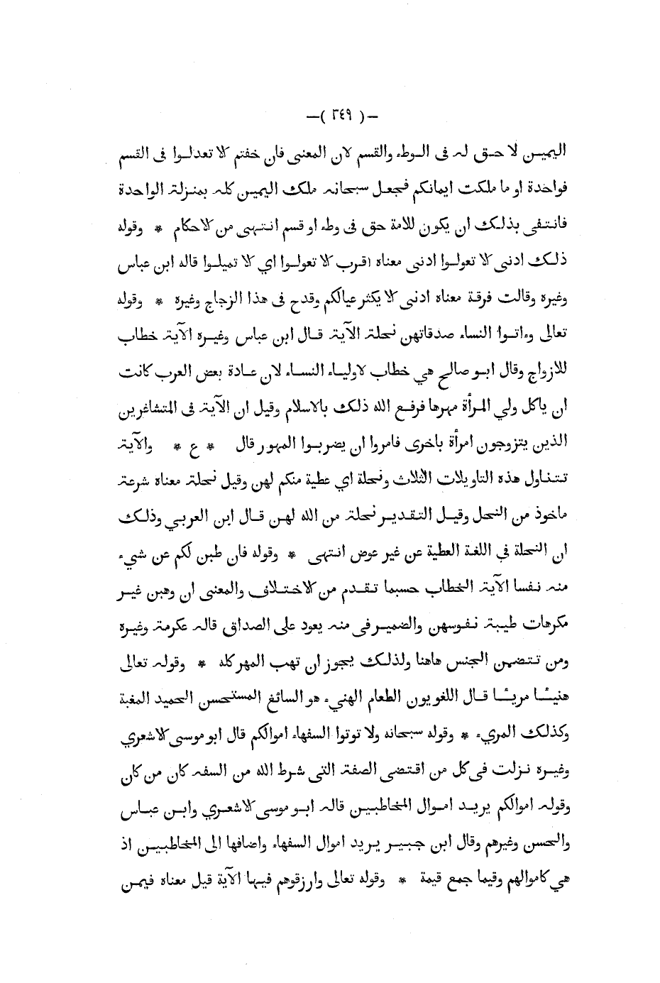 اليمين لا حق له في الوطء والقسم لان المعنى فإن خفتم ألا تعدلوا في القسم فواحدة أو ما ملكت أيمانكم فجعل سبحانه ملك اليمين كله بمنزلة الواحدة فانتفى بذلك أن يكون للامة حق في وطء أو قسم انتهى من الاحكام وقوله ذلك ادنى ألا تعولوا ادنى معناه اقرب ألا تعولوا أي ألا تميلوا قاله ابن عباس وغيره وقالت فرقة معناه ادنى ألا يكثر عيالكم وقدح في هذا الزجاج وغيره وقوله تعالى وأتوا النساء صدقاتهن نحلة الآية قال ابن عباس وغيره الآية خطاب للازواج وقال أبو صالح هي خطاب لاولياء النساء لان عادة بعض العرب كانت أن يأكل ولي المرأة مهرها فرفع الله ذلك بالاسلام وقيل ان الآية في المتشاغرين الذين يتزوجون امرأة بأخرى فأمروا أن يضربوا المهور قال ع والآية تتناول هذه التأويلات الثلاث ونحلة أي عطية منكم لهن وقيل نحلة معناه شرعة مأخوذ من النحل وقيل التقدير نحلة من الله لهن قال ابن العربي وذلك أن النحلة في اللغة العطية عن غير عوض انتهى وقوله فإن طبن لكم عن شيء منه نفسا الآية الخطاب حسبما تقدم من الاختلاف والمعنى إن وهبن غير مكرهات طيبة نفوسهن والضمير في منه يعود على الصداق قاله عكرمة وغيره ومن تتضمن الجنس ها هنا ولذلك يجوز أن تهب المهر كله وقوله تعالى هنيئا مريئا قال اللغويون الطعام الهنيء هو السائغ المستحسن الحميد المغبة وكذلك المريء وقوله سبحانه ولا تؤتوا السفهاء أموالكم قال أبو موسى الاشعري وغيره نزلت في كل من اقتضى الصفة التي شرط الله من السفه كان من كان وقوله أموالكم يريد اموال المخاطبين قاله أبو موسى الاشعري وابن عباس والحسن وغيرهم وقال ابن جبير يريد اموال السفهاء واضافها إلى المخاطبين إذ هي كاموالهم وقيما جمع قيمة وقوله تعالى وارزقوهم فيها الآية قيل معناه فيمن