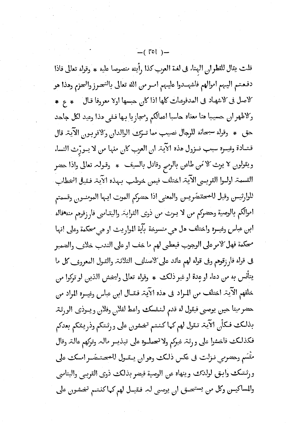 قلت يقال للقطر أن الهناء في لغة العرب كذا رأيته منصوصا عليه وقوله تعالى فإذا دفعتم إليهم أموالهم فأشهدوا عليهم امر من الله تعالى بالتحرز والحزم وهذا هو الاصل في الاشهاد في المدفوعات كلها إذا كان حبسها أولا معروفا قال ع والاظهر أن حسيبا هنا معناه حاسبا أعمالكم ومجازيا بها ففي هذا وعيد لكل جاحد حق وقوله سبحانه للرجال نصيب مما ترك الوالدان والأقربون الآية قال قتادة وغيره سبب نزول هذه الآية أن العرب كان منها من لا يورث النساء ويقولون لا يرث إلا من طاعن بالرمح وقاتل بالسيف وقوله تعالى وإذا حضر القسمة أولوا القربى الآية اختلف فيمن خوطب بهذه الآية فقيل الخطاب للوارثين وقيل للمحتضرين والمعنى إذا حضركم الموت أيها المؤمنون وقسمتم أموالكم بالوصية وحضركم من لا يرث من ذوى القرابة واليتامى فارزقوهم منه قاله ابن عباس وغيره واختلف هل هي منسوخة بآية المواريث أو هي محكمة وعلى انها محكمة فهل الأمر على الوجوب فيعطى لهم ما خف أو على الندب خلاف والضمير في قوله فارزقوهم وفي قوله لهم عائد على الاصناف الثلاثة والقول المعروف كل ما يتأنس به من دعاء أو عدة أو غير ذلك وقوله تعالى وليخش الذين لو تركوا من خلفهم الآية اختلف من المراد في هذه الآية فقال ابن عباس وغيره المراد من حضر ميتا حين يوصى فيقول له قدم لنفسك وأعط لفلان وفلان ويوذى الورثة بذلك فكأن الآية تقول لهم كما كنتم تخشون على ورثتكم وذريتكم بعدكم فكذلك فاخشوا على ورثة غيركم ولا تحملوه على تبذير ماله وتركهم عالة وقال مقسم وحضرمي نزلت في عكس ذلك وهو أن يقول للمحتضر امسك على ورثتك وأبق لولدك وينهاه عن الوصية فيضر بذلك ذوى القربى واليتامى والمساكين وكل من يستحق أن يوصى له فقيل لهم كما كنتم تخشون على
