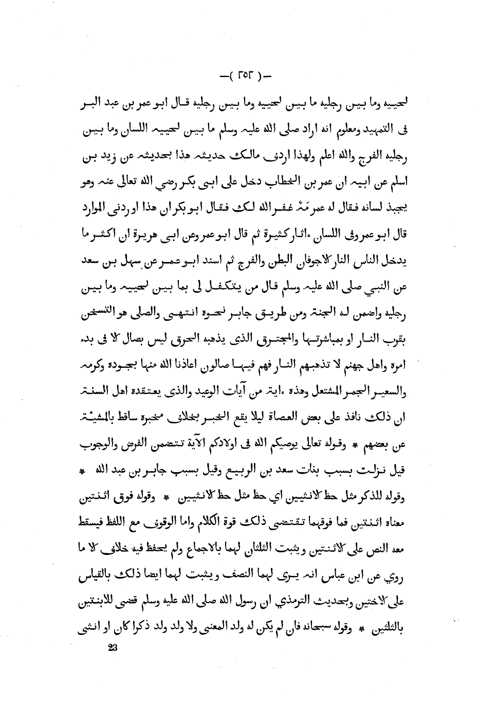 قال أبو عمر بن عبد البر في التمهيد ومعلوم أنه أراد صلى الله عليه و سلم ما بين لحييه اللسان وما بين رجليه الفرج والله أعلم ولهذا أردف مالك حديثه هذا بحديثه عن زيد بن أسلم عن أبيه أن عمر بن الخطاب دخل على أبي بكر رضي الله تعالى عنه وهو يجبذ لسانه فقال له عمر مه غفر الله لك فقال أبو بكر إن هذا أوردني الموارد قال أبو عمر وفي اللسان آثار كثيرة ثم قال أبو عمر وعن أبي هريرة أن أكثر ما يدخل الناس النار الأجوفان البطن والفرج ثم أسند أبو عمر عن سهل بن سعد عن النبي صلى الله عليه و سلم قال من يتكفل لي بما بين لحييه وما بين رجليه وأضمن له الجنة ومن طريق جابر نحوه انتهى والصلى هو التسخن بقرب النار أو بمباشرتها والمجترق الذي يذهبه الحرق ليس بصال إلا في بدء أمره وأهل جهنم لا تذهبهم النار فهم فيها صالون أعاذنا الله منها بجوده وكرمه والسعير الجمر المشتعل وهذه آية من آيات الوعيد والذي يعتقده أهل السنة أن ذلك نافذ على بعض العصاة ليلا يقع الخبر بخلاف مخبره ساقط بالمشيئة عن بعضهم وقوله تعالى يوصيكم الله في أولادكم الآية تتضمن الفرض والوجوب قيل نزلت بسبب بنات سعد بن الربيع وقيل بسبب جابر بن عبد الله وقوله للذكر مثل حظ الأثنيين أي حظ مثل حظ الأنثيين وقوله فوق اثنتين معناه اثنتين فما فوقهما تقتضي ذلك قوة الكلام وأما الوقوف مع اللفظ فيسقط معه النص علىالإثنين ويثبت الثلثان لهما بالإجماع ولم يحفظ فيه خلاف إلا ما روي عن ابن عباس أنه يرى لهما النصف ويثبت لهما أيضا ذلك بالقياس على الأختين وبحديث الترمذي أن رسول الله صلى الله عليه و سلم قضى للابنتين بالثلثين وقوله سبحانه فإن لم يكن له ولد المعنى ولا ولد ولد ذكرا كان أو أنثى