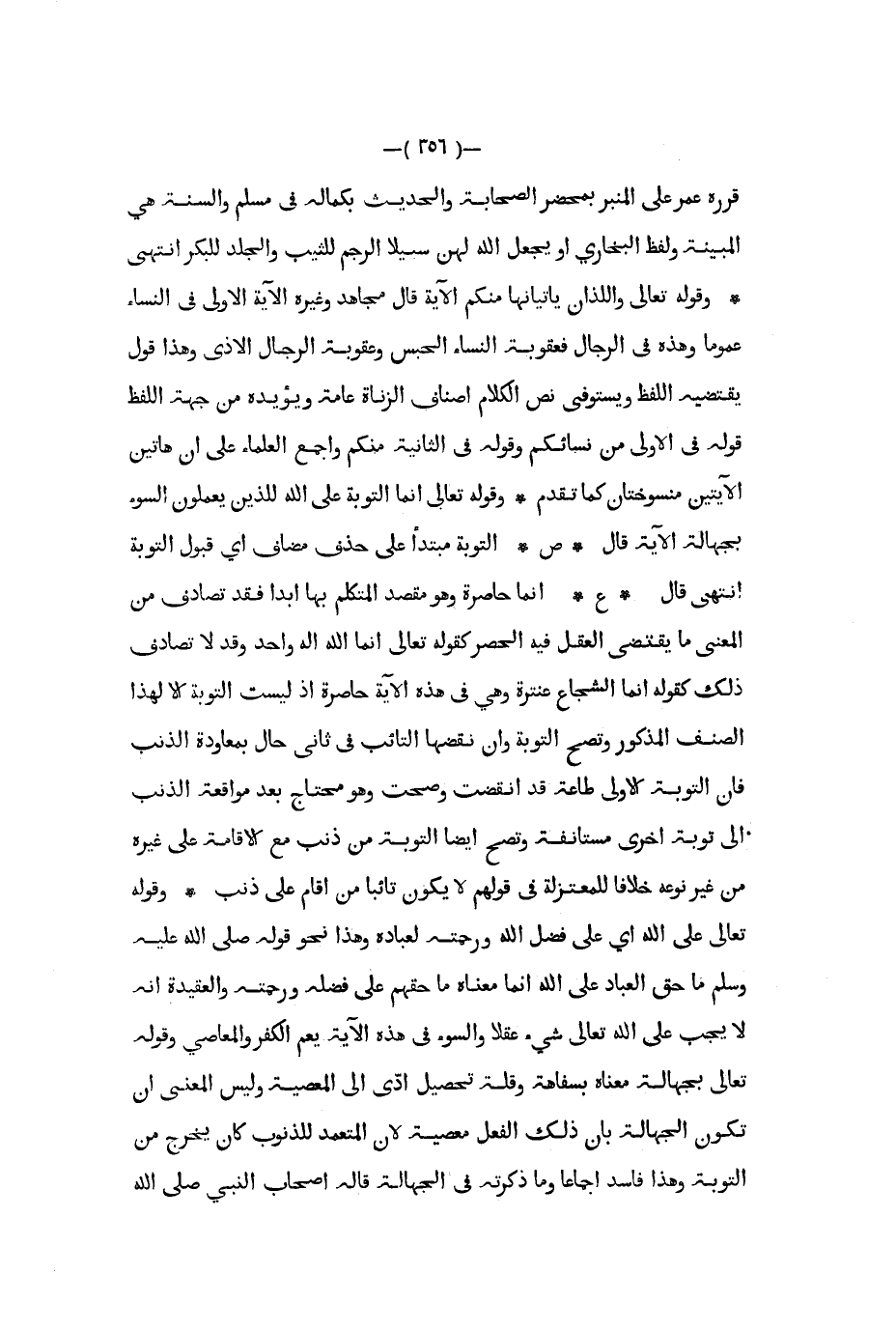 قرره عمر على المنبر بمحضر الصحابة والحديث بكماله في مسلم والسنة هي المبينة ولفظ البخاري أو يجعل الله لهن سبيلا الرجم للثيب والجلد للبكر انتهى وقوله تعالى واللذان يأتيانها منكم الآية قال مجاهد وغيره الآية الأولى في النساء عموما وهذه في الرجال فعقوبة النساء الحبس وعقوبة الرجال الأذى وهذا قول يقتضيه اللفظ ويستوفي نص الكلام أصناف الزناة عامة ويؤيده من جهة اللفظ قوله في الأولى من نسائكم وقوله في الثانية منكم وأجمع العلماء على أن هاتين الآيتين منسوختان كما تقدم وقوله تعالى إنما التوبة على الله للذين يعملون السوء بجهالة الآية قال ص التوبة مبتدأ على حذف مضاف أي قبول التوبة انتهى قال ع إنما حاصرة وهو مقصد المتكلم بها أبدا فقد تصادف من المعنى ما يقتضي العقل فيه الحصر كقوله تعالى إنما الله إله واحد وقد لا تصادف ذلك كقوله إنما الشجاع عنترة وهي في هذه الآية حاصرة إذ ليست التوبة إلا لهذا الصنف المذكور وتصح التوبة وإن نقضها التائب في ثاني حال بمعاودة الذنب فإن التوبة الأولى طاعة قد إنقضت وصحت وهو محتاج بعد مواقعة الذنب إلى توبة أخرى مستأنفة وتصح أيضا التوبة من ذنب مع الإقامة على غيره من غير نوعه خلافا للمعتزلة في قولهم لا يكون تائبا من أقام على ذنب وقوله تعالى على الله أي على فضل الله ورحمته لعباده وهذا نحو قوله صلى الله عليه و سلم ما حق العباد على الله إنما معناه ما حقهم على فضله ورحمته والعقيدة أنه لا يجب على الله تعالى شيء عقلا والسوء في هذه الآية يعم الكفر والمعاصي وقوله تعالى بجهالة معناه بسفاهة وقلة تحصيل أدى إلى المعصية وليس المعنى أن تكون الجهالة بأن ذلك الفعل معصية لأن المتعمد للذنوب كان يخرج من التوبة وهذا فاسد إجماعا وما ذكرته في الجهالة قاله أصحاب النبي صلى الله