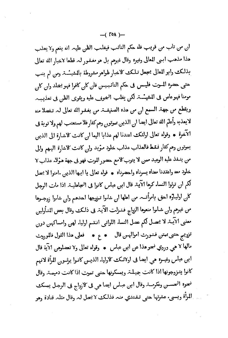 أن من تاب من قريب فله حكم التائب فيغلب الظن عليه أنه ينعم ولا يعذب هذا مذهب أبي المعالي وغيره وقال غيرهم بل هو مغفور له قطعا لأخبار الله تعالى بذلك وأبو المعالي يجعل تلك الأخبار ظواهر مشروطة بالمشيئة ومن لم يتب حتى حضره الموت فليس في حكم التائبين فإن كان كافرا فهو يخلد وإن كان مؤمنا فهو عاص في المشيئة لكن يغلب الخوف عليه ويقوى الظن في تعذيبه ويقطع من جهة السمع أن من هذه الصنيفة من يغفر الله تعالى له تفضلا منه لا يعذبه وأعلم الله تعالى أيضا أن الذين يموتون وهم كفار فلا مستعتب لهم ولا توبة في الآخرة وقوله تعالى اولئك اعتدنا لهم عذابا أليما إن كانت الإشارة الى الذين يموتون وهم كفار فقط فالعذاب عذاب خلود مؤبد وان كانت الاشارة إليهم وإلى من ينفذ عليه الوعيد ممن لا يتوب إلا مع حضور الموت فهو في جهة هؤلاء عذاب لا خلود معه واعتدنا معناه يسرناه وأحضرناه قوله تعالى يا أيها الذين ءامنوا لا يحل لكم أن ترثوا النساء كرها الآية قال ابن عباس كانوا في الجاهلية إذا مات الرجل كان اولياؤه أحق بامرأته من أهلها إن شاءوا تزوجها أحدهم وإن شاءوا زوجوها من غيرهم وإن شاؤا منعوها الزواج فنزلت الآية في ذلك وقال بعض المتأولين معنى الآية لا يحل لكم عضل النساء اللواتي أنتم أولياء لهن وإمساكهن دون تزويج حتى يمتن فتورث أموالهن قال ع فعلى هذا القول فالموروث مالها لا هي وروي نحو هذا عن ابن عباس وقوله تعالى ولا تعضلوهن الآية قال ابن عباس وغيره هي أيضا في أولئك الأولياء الذين كانوا يرثون المرأة لأنهم كانوا يتزوجونها إذا كانت جميلة ويمسكونها حتى تموت إذا كانت دميمة وقال نحوه الحسن وعكرمةو قال ابن عباس أيضا هي في الأزواج في الرجل يمسك المرأة ويسيء عشرتها حتى تفتدي منه فذلك لا يحل له وقال مثله قتادة وهو