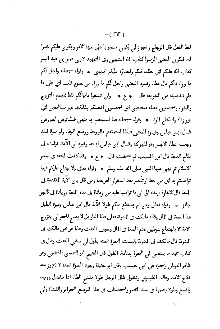 لفظ الفعل قال الزجاج ويجوز أن يكون منصوبا على جهة الأمر ويكون عليكم خبرا له فيكون المعنى الزموا كتاب الله انتهى وفي التمهيد لأبي عمر بن عبد البر كتاب الله عليكم أي حكمه فيكم وقضاؤه عليكم انتهى وقوله سبحانه وأحل لكم ما وراء ذلكم قال عطاء وغيره المعنى وأحل لكم ما وراء من حرم قلت أي على ما علم تفصيله من الشريعة قال ع وإن تبتغوا باموالكم لفظ يجمع التزوج والشراء ومحصنين معناه متعففين أي تحصنون أنفسكم بذلك غير مسافحين أي غير زناة والسفاح الزنا وقوله سبحانه فما استمتعتم به منهن فأتوهن أجورهن قال ابن عباس وغيره المعنى فإذا استمتعتم بالزوجة ووقع الوطء ولو مرة فقد وجب إعطاء الأجر وهو المهر كله وقال ابن عباس أيضا وغيره إن الآية نزلت في نكاح المتعة قال ابن المسيب ثم نسخت قال ع وقد كانت المتعة في صدر الإسلام ثم نهى عنها النبي صلى الله عليه و سلم وقوله تعالى ولا جناح عليكم فيما تراضيتم به أي من حط أو تأخير بعد استقرار الفريضة ومن قال بأن الآية المتقدمة في المتعة قال الإشارة بهذه إلى أن ما ترضيا عليه من زيادة في مدة المتعة وزيادة في الأجر جائز وقوله تعالى ومن لم يستطع منكم طولا الآية قال ابن عباس وغيره الطول هنا السعة في المال وقاله مالك في المدونة فعلى هذا التأويل لا يصح للحر أن يتزوج الأمة إلا باجتماع شرطين عدم السعة في المال وخوف العنت وهذا هو نص مالك في المدونة قال مالك في المدونة وليست الحرة تحته بطول أن خشي العنت وقال في كتاب محمد ما يقتضي أن الحرة بمثابة الطول قال الشيخ أبو الحسن اللخمي وهو ظاهر القرآن ونحوه عن ابن حبيب وقال أبو حنيفة وجود الحرة تحته لا يجوز معه نكاح الأمة وقال الطبري وتقول طال الرجل طولا بفتح الطاء إذا تفضل ووجد واتسع وطولا بضمها في ضد القصر والمحصنات في هذا الموضع الحرائر والفتاة وإن