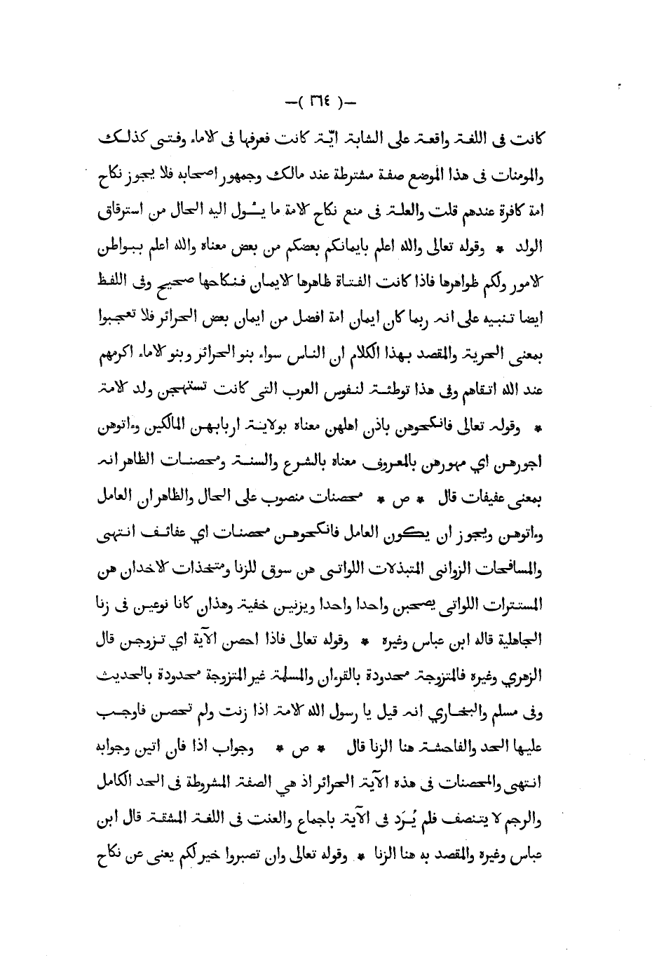 كانت في اللغة واقعة على الشابة اية كانت فعرفها في الإماء وفتى كذلك والمؤمنات في هذا الموضع صفة مشترطة عند مالك وجمهور أصحابه فلا يجوز نكاح أمة كافرة عندهم قلت والعلة في منع نكاح الأمة ما يؤول إليه الحال من استرقاق الولد وقوله تعالى والله أعلم بإيمانكم بعضكم من بعض معناه والله أعلم ببواطن الأمور ولكم ظواهرها فإذا كانت الفتاة ظاهرها الإيمان فنكاحها صحيح وفي اللفظ أيضا تنبيه على أنه ربما كان إيمان أمة أفضل من إيمان بعض الحرائر فلا تعجبوا بمعى الحرية والمقصد بهذا الكلام أن الناس سواء بنو الحرائر وبنو الإماء أكرمهم عند الله اتقاهم وفي هذا توطئة لنفوس العرب التي كانت تستهجن ولد الأمة وقوله تعالى فانكحوهن بإذن أهلهن معناه بولاية أربابهن المالكين وأتوهن أجورهن أي مهورهن بالمعروف معناه بالشرع والسنة ومحصنات الظاهر أنه بمعنى عفيفات قال ص محصنات منصوب على الحال والظاهر أن العامل وأتوهن ويجوز أن يكون العامل فانكحوهن محصنات أي عفائف انتهى والمسافحات الزواني المتبذلات اللواتي هن سوق للزنا ومتخذات الأخدان هن المستترات اللواتي يصحبن واحد واحد ويزنين خفية وهذا كانا نوعين في زنا الجاهلية قاله ابن عباس وغيره وقوله تعالى فإذا أحصن الآية أي تزوجن قال الزهري وغيره فالمتزوجة محدودة بالقرآن والمسلمة غير المتزوجة محدودة بالحديث وفي مسلم والبخاري أنه قيل يا رسول الله الأمة إذا زنت ولم تحصن فأوجب عليها الحد والفاحشة هنا الزنا قال ص وجواب إذا فإن اتين وجوابه وانتهى والمحصنات في هذه الآية الحرائر إذ هي الصفة المشروطة في الحد الكامل والرجم لا يتنصف فلم يرد في الآية بإجماع والعنت في اللغة المشقة قال ابن عباس وغيره والمقصد به هنا الزنا وقوله تعالى وإن تصبروا خير لكم يعني عن نكاح