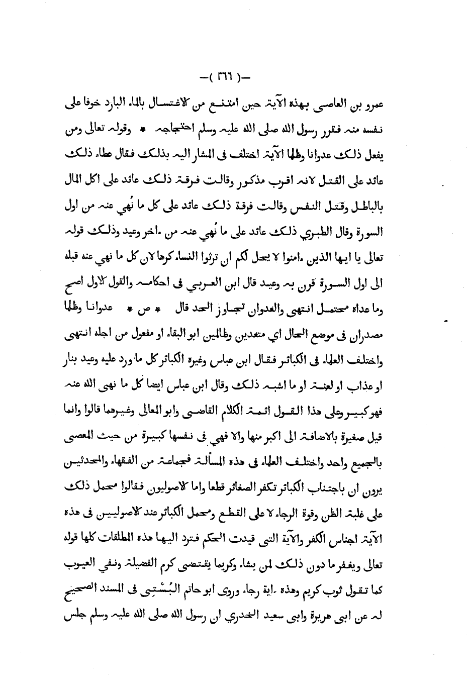 عمرو بن العاص بهذه الآية حين امتنع من الأغتسال بالماء البارد خوفا على نفسه منه فقرر رسول الله صلى الله عليه و سلم احتجاجه وقوله تعالى ومن يفعل ذلك عدوانا وظلما الآية اختلف في المشار إليه بذلك فقال عطاء ذلك عائد على القتل لأنه أقرب مذكور وقالت فرقة ذلك عائد على أكل المال بالباطل وقتل النفس وقالت فرقة ذلك عائد على كل ما نهي عنه من أول السورة وقال الطبري ذلك عائد على ما نهي عنه من آخر وعيد وذلك قوله تعالى يا أيها الذين آمنوا لا يحل لكم أن ترثوا النساء كرها لأن كل ما نهي عنه قبله إلى أول السورة قرن به وعيد قال ابن العربي في أحكامه والقول الأول أصح وما عداه محتمل انتهى والعدوان تجاوز الحد قال ص عدوانا وظلما مصدران في موضع الحال أي متعدين وظالمين أبو البقاء أو مفعول من أجله انتهى واختلف العلماء في الكبائر فقال ابن عباس وغيره الكبائر كل ما ورد عليه وعيد بنار أو عذاب أو لعنة أو ما أشبه ذلك وقال ابن عباس ايضا كل ما نهي الله عنه فهو كبير وعلى هذا القول أئمة الكلام القاضي وأبو المعالي وغيرهما قالوا وإنما قيل صغيرة بالإضافة إلى أكبر منها وإلا فهي في نفسها كبيرة من حيث المعصى بالجميع واحد واختلف العلماء في هذه المسألة فجماعة من الفقهاء والمحدثين يرون أن بإجتناب الكبائر تكفر الصغائر قطعا وأما الأصوليون فقالوا محمل ذلك على غلبة الظن وقوة الرجاء لا على القطع ومحمل الكبائر عند الأصوليين في هذه الآية أجناس الكفر والآية التي قيدت الحكم فترد إليها هذه المطلقات كلها قوله تعالى ويغفر ما دون ذلك لمن يشاء وكريما يقتضي كرم الفضيلة ونفي العيوب كما تقول ثوب كريم وهذه آية رجاء وروى أبو حاتم البستي في المسند الصحيح له عن أبي هريرة وأبي سعيد الخدري أن رسول الله صلى الله عليه و سلم جلس