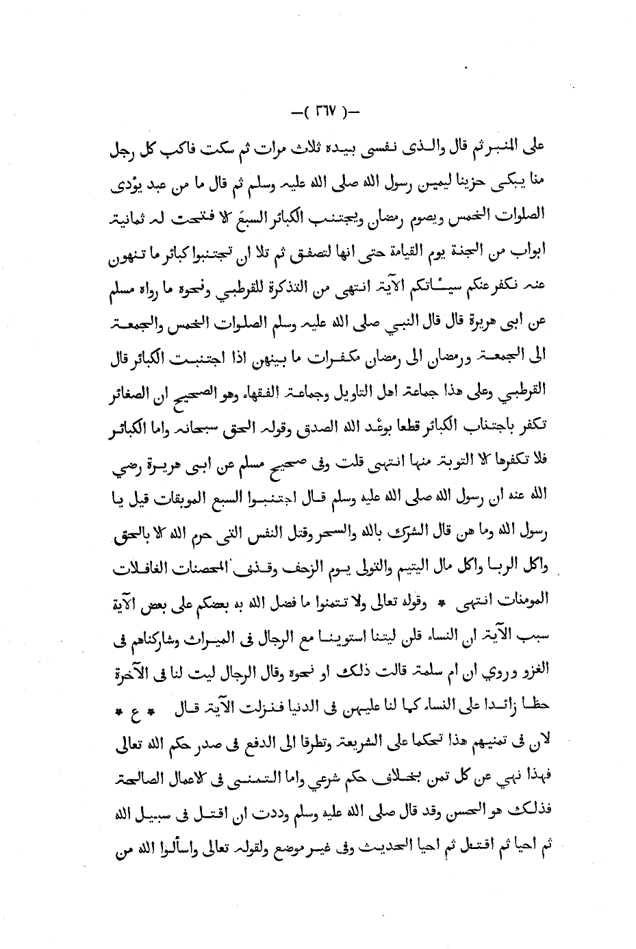 على المنبر ثم قال والذي نفسي بيده ثلاث مرات ثم سكت فأكب كل رجل منا يبكي حزينا ليمين رسول الله صلى الله عليه و سلم ثم قال ما من عبد يؤدي الصلوات الخمس ويصوم رمضان ويجتنب الكبائر السبع إلا فتحت له ثمانية أبواب من الجنة يوم القيامة حتى أنها لتصفق ثم تلا إن تجتنبوا كبائر ما تنهون عنه نكفر عنكم سيئاتكم الآية انتهى من التذكرة للقرطبي ونحوه ما رواه مسلم عن أبي هريرة قال قال النبي صلى الله عليه و سلم الصلوات الخمس والجمعة إلى الجمعة ورمضان إلى رمضان مكفرات ما بينهن إذا اجتنبت الكبائر قال القطربي وعلى هذا جماعة أهل التأويل وجماعة الفقهاء وهو الصحيح أن الصغائر تكفر باجتناب الكبائر قطعا بوعد الله الصدق وقوله الحق سبحانه وأما الكبائر فلا تكفرها إلا التوبة منها انتهى قلت وفي صحيح مسلم عن أبي هريرة رضي الله عنه أن رسول الله صلى الله عليه و سلم قال اجتنبوا السبع الموبقات قيل يا رسول الله وما هن قال الشرك بالله والسحر وقتل النفس التي حرم الله إلا بالحق وأكل الربا وأكل مال اليتيم والتولي يوم الزحف وقذف المحصنات الغافلات المؤمنات انتهى وقوله تعالى ولا تتمنوا ما فضل الله به بعضكم علىبعض الآية سبب الآية أن النساء قلن ليتنا استوينا مع الرجال في الميراث وشاركناهم في الغزو وروي أن أم سلمة قالت ذلك أو نحوه وقال الرجال ليت لنا في الآخرة حظا زائدا على النساء كما لنا عليهن في الدنيا فنزلت الآية قال ع لأن في تمنيهم هذا تحكما على الشريعة وتطرقا إلىالدفع في صدر حكم الله تعالى فهذا نهي عن كل تمن بخلاف حكم شرعي وأما التمني في الأعمال الصالحة فذلك هو الحسن وقد قال صلى الله عليه و سلم وددت أن اقتل في سبيل الله ثم أحيا ثم أقتل ثم أحيا الحديث وفي غير موضع ولقوله تعالى واسألوا الله من