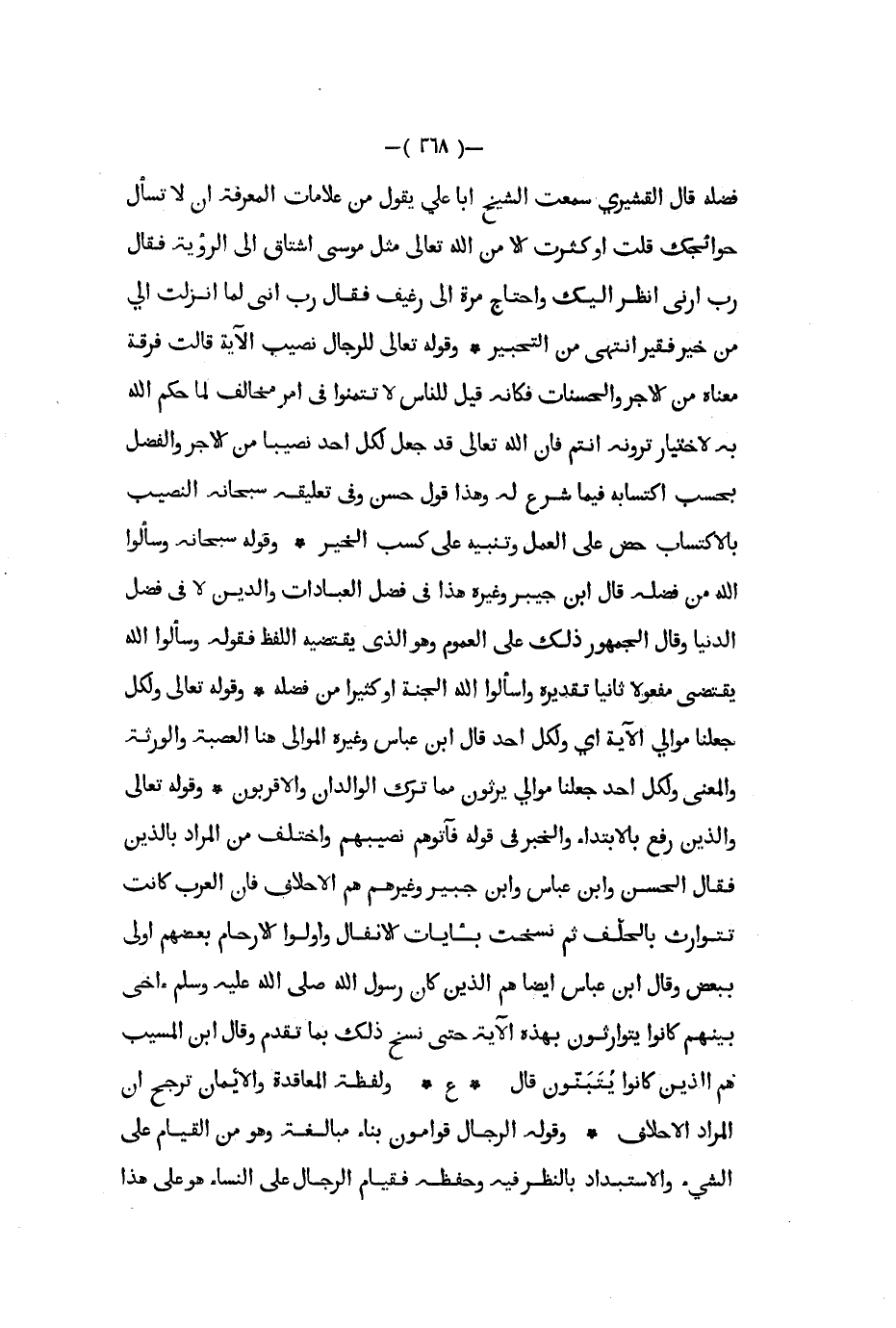 فضله قال القشيري سمعت الشيخ أبا علي يقول من علامات المعرفه أن لا تسأل حوائجك قلت أو كثرت إلا من الله تعالى مثل موسى اشتقاق إلى الرؤية فقال رب أرني أنظر إليك واحتاج مرة إلى رغيف فقال رب إني لما أنزلت إلي من خير فقير انتهى من التجبير وقوله تعالى للرجال نصيب الآية قالت فرقة معناه من الأجر والحسنات فكأنه قيل للناس لا تتمنوا في أمر مخالف لما حكم الله به لأختيار ترونه أنتم فإن الله تعالى قد جعل لكل أحد نصيبا من الأجر والفضل بحسب اكتسابه فيما شرع له وهذا قول حسن وفي تعليقه سبحانه النصيب بالإكتساب حض على العمل وتنبيه على كسب الخير وقوله سبحانه وسألوا الله من فضله قال ابن جبير وغيره هذا في فضل العبادات والدين لا في فضل الدنيا وقال الجمهور ذلك على العموم وهو الذي يقتضيه اللفظ فقوله وسألوا الله يقتضي مفعولا ثانيا تقديره وأسالوا الله الجنة او كثيرا من فضله وقوله تعالى ولكل جعلنا موالي الآية أي ولكل أحد قال ابن عباس وغيره الموالي هنا العصبة والورثة والمعنى ولكل أحد جعلنا موالي يرثون مما ترك الوالدان والأقربون وقوله تعالى واللذين رفع بالابتداء والخبر في قوله فآتوهم نصيبا واختلف من المراد بالذين فقال الحسن وابن عباس وابن جبير وغيرهم هم الأحلاف فإن العرب كانت تتوارث بالحلف ثم نسخت بآيات الأنفال وأولوا الأرحام بعضهم اولى ببعض وقال ابن عباس أيضا هم الذين كان رسول الله صلى الله عليه و سلم آخى بينهم كانوا يتوارثون بهذه الآية حتى نسخ ذلك بما تقدم وقال ابن المسيب هم الذين كانوا يتبنون قال ع ولفظة المعاقدة والإيمان ترجح أن المراد الأحلاف وقوله الرجال قوامون بناء مبالغة وهو من القيام على الشيء والاستبداد بالنظر فيه وحفظه فقيام الرجال على النساء هو على هذا