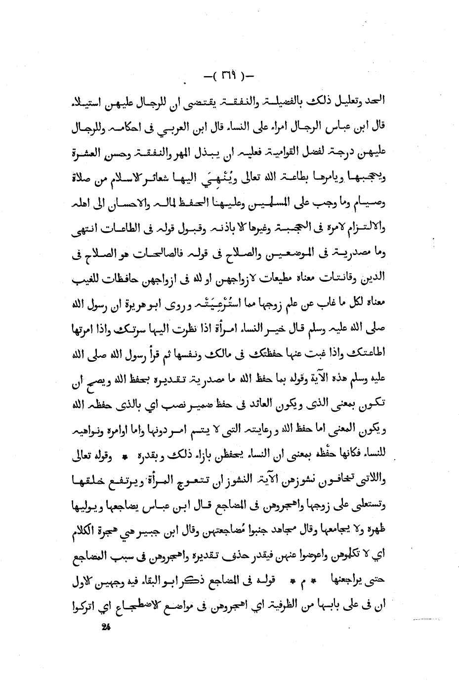 الحد وتعليل ذلك بالفضيلة والنفقة يقتضي أن للرجال عليهن استيلاء قال ابن عباس الرجال أمراء على النساء قال ابن العربي في أحكامه وللرجال عليهن درجة لفضل القوامية فعليه أن يبذل المهر والنفقة وحسن العشرة ويحجبها ويأمرها بطاعة الله تعالى وينهي إليها شعائر الإسلام من صلاة وصيام وما وجب على المسلمين وعليها الحفظ لماله والإحسان إلى أهله والالتزام لأمره في الحجبة وغيرها إلا بإذنه وقبول قوله في الطاعات انتهى وما مصدرية في الموضعين والصلاح في قوله فالصالحات هو الصلاح في الدين وقانتات معناه مطيعات لأزواجهن أو لله في أزواجهن حافظات للغيب معناه لكل ما غاب عن علم زوجها مما استرعيته وروى أبو هريرة أن رسول الله صلى الله عليه و سلم قال خير النساء امرأة إذا نظرت إليها سرتك وإذا أمرتها أطاعتك وإذا غبت عنها حفظتك في مالك ونفسها ثم قرأ رسول الله صلى الله عليه و سلم هذه الآية وقوله بما حفظ الله ما مصدرية تقديره بحفظ الله ويصح أن تكون بمعنى الذي ويكون العائد في حفظ ضمير نصب أي بالذي حفظه الله ويكون المعنى أما حفظ الله ورعايته التي لا يتم أمر دونها وأما أوامره ونواهيه للنساء فكأنها حفظه بمعنى أن النساء يحفظن بازاء ذلك وبقدره وقوله تعالى واللاتي تخافون نشوزهن الآية النشوز أن تتعوج المرأة ويرتفع خلقها وتستعلى على زوجها واهجروهن في المضاجع قال ابن عباس يضاجعها ويوليها ظهره ولا يجامعها وقال مجاهد جنبوا مضاجعتهن وقال ابن جبير هي هجرة الكلام أي لا تكلموهن واعرضوا عنهن فيقدر حذف تقديره وأهجروهن في سبب المضاجع حتى يراجعنها م قوله في المضاجع ذكر أبو البقاء فيه وجهين الأول أن في على بابها من الظرفية أي اهجروهن في مواضع الإضطجاع أي أتركوا