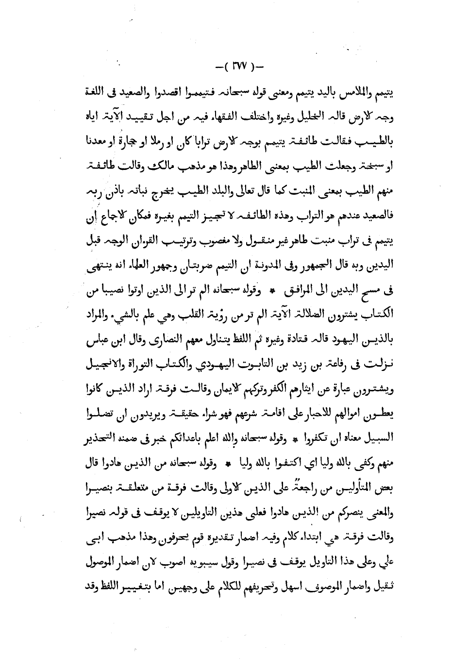 يتيمم والملامس باليد يتيمم ومعنى قوله سبحانه فتيمموا اقصدوا والصعيد في اللغة وجه الأرض قاله الخليل وغيره واختلف الفقهاء فيه من أجل تقييد الآية أياه بالطيب فقالت طائفة يتيمم بوجه الأرض ترابا كان أو رملا أو حجارة أو معدنا أو سبخة وجعلت الطيب بمعنى الطاهر وهذا هو مذهب مالك وقال طائفة منهم الطيب بمعنى المنبت كما قال تعالى والبلد الطيب يخرج نباته بإذن ربه فالصعيد عندهم هو التراب وهذه الطائفة لا تجيز التيمم بغيره فمكان الإجماع أن يتيمم في تراب منبت طاهر غير منقول ولا مغصوب وترتيب القرآن الوجه قبل اليدين وبه قال الجمهور وفي المدونة أن التيمم ضربتان وجمهور العلماء أنه ينتهي في مسح اليدين إلى المرافق وقوله سبحانه ألم تر إلى الذين أوتوا نصيبا من الكتاب يشترون الضلالة الآية ألم تر من رؤية القلب وهي علم بالشيء والمراد باللذين اليهود قاله قتادة وغيره ثم اللفظ يتناول معهم النصارى وقال ابن عباس نزلت في رفاعة بن زيد بن التابوت اليهودي والكتاب التوراة والإنجيل ويشترون عبارة عن إيثارهم الكفر وتركهم الإيمان وقالت فرقة أراد اللذين كانوا يعطون أموالهم للأحبار على إقامة شرعهم فهو شراء حقيقة ويريدون أن تضلوا السبيل معناه أن تكفروا وقوله سبحانه والله أعلم بأعدائكم خبر في ضمنه التحذير منهم وكفى بالله وليا أي اكتفوا بالله وليا وقوله سبحانه من الذين هادوا قال بعض المتأولين من راجعة على الذين الأولى وقالت فرقة من متعلقة بنصيرا والمعنى ينصركم من الذين هادوا فعلى هذين التأويلين لا يوقف في قوله نصيرا وقالت فرقة هي ابتداء كلام وفيه إضمار تقديره قوم يحرفون وهذا مذهب أبي علي وعلى هذا التأويل يوقف في نصيرا وقول سيبويه أصوب لأن إضمار الموصول ثقيل وإضمار الموصوف أسهل وتحريفهم للكلام على وجهين أما بتغيير اللفظ وقد