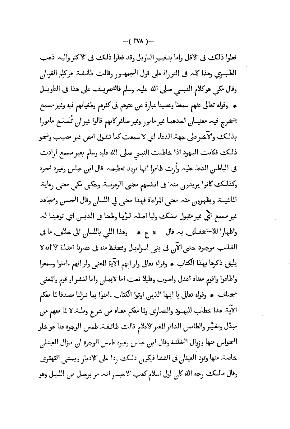 فعلوا ذلك في الأقل وأما بتغيير التأويل وقد فعلوا ذلك في الأكثر وإليه ذهب الطبري وهذا كله في التوراة على قول الجمهور وقالت طائفة هو كلم القرآن وقال مكي هو كلام النبي صلى الله عليه و سلم فالتحريف على هذا في التأويل وقوله تعالى عنهم سمعنا وعصينا عبارة عن عتوهم في كفرهم وطغيانهم فيه وغير مسمع يتخرج فيه معنيان أحدهما غير مأمور وغير صاغر كأنهم قالوا غير أن تسمع مأمورا بذلك والآخر على جهة الدعاء أي لا سمعت كما تقول إمض غير مصيب ونحو ذلك فكانت اليهود إذا خاطبت النبي صلى الله عليه و سلم بغير مسمع أرادت في الباطن الدعاء عليه وأرت ظارهرا أنها تريد تعظيمه قال ابن عباس وغيره نحوه وكذلك كانوا يريدون منه في أنفسهم معنى الرعونة وحكى مكي معنى رعاية الماشية ويظهرون منه معنى المراعاة فهذا معنى لي اللسان وقال الحسن ومجاهد غير مسمع أي غير مقبول منك وليا أصله لويا وطعنا في الدين أي توهينا له وإظهارا للاستخفاف به قال ع وهذا اللي باللسان إلى خلاف ما في القلب موجود حتى الآن في بني إسرائيل ويحفظ منه في عصرنا أمثله إلا أنه لايليق ذكرها بهذا الكتاب وقوله تعالى ولو أنهم الآية المعنى ولو أنهم ءامنوا وسمعوا وأطاعوا واقوم معناه أعدل وأصوب وقليلا نعت أما لإيمان وإما لنفر أو قوم والمعنى مختلف وقوله تعالى يا أيها الذين اوتوا الكتاب ءامنوا بما نزلنا مصدقا لما معكم الآية هذا خطاب لليهود والنصارى ولما معكم معناه من شرع وملة لا لما معهم من مبدل ومغير والطامس الداثر المغير الاعلام قالت طائفة طمس الوجوه هنا هو خلو الحواس منها وزوال الخلقة وقال ابن عباس وغيره طمس الوجوه أن تزال العينان خاصة منها وترد العينان في القفا فيكون ذلك ردا على الأدبار ويمشي القهقري وقال مالك رحمه الله كان اول إسلام كعب الأحبار أنه مر برجل من الليل وهو