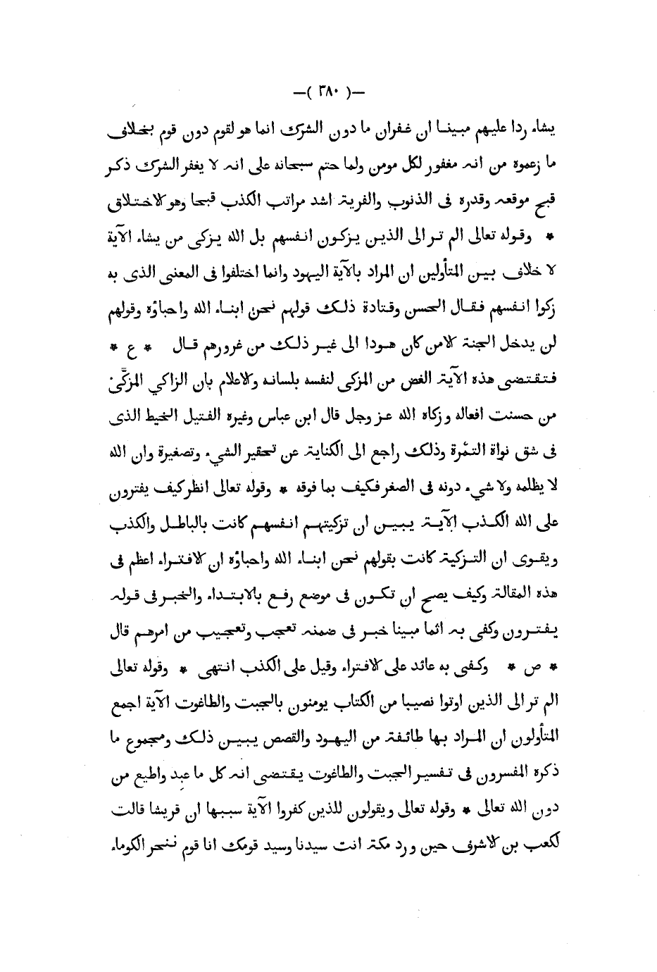 يشاء ردا عليهم مبينا أن غفران ما دون الشرك إنما هو لقوم دون قوم بخلاف ما زعموه من أنه مغفور لكل مؤمن ولما حتم سبحانه على أنه لا يغفر الشرك ذكر قبح موقعه وقدره في الذنوب والفرية أشد مراتب الكذب قبحا وهو الاختلاق وقوله تعالى ألم تر إلى الذين يزكون أنفسهم بل الله يزكي من يشاء الآية لا خلاف بين المتأولين إن المراد بالآية اليهود وإنما اختلفوا في المعنى الذي به زكوا أنفسهم فقال الحسن وقتادة ذلك قولهم نحن ابناء الله واحباؤه وقولهم لن يدخل الجنة إلا من كان هودا إلى غير ذلك من غرورهم قال ع فتقتضي هذه الآية الغض من المزكي لنفسه بلسانه والإعلام بأن الزاكي المزكي من حسنت أفعاله وزكاه الله عز و جل قال ابن عباس وغيره الفتيل الخيط الذي في شق نواة التمرة وذلك راجع إلى الكناية عن تحقير الشيء وتصغيره وإن الله لا يظلمه ولا شيء دونه في الصغر فكيف بما فوقه وقوله تعالى أنظر كيف يفترون على الله الكذب الآية يبين أن تزكيتهم أنفسهم كانت بالباطل والكذب ويقوى أن التزكية كانت بقولهم نحن أبناء الله وأحباؤه إن الإفتراء أعظم في هذه المقالة وكيف يصح أن تكون في موضع رفع بالابتداء والخبر في قوله يفترون وكفى به إثما مبينا خبر في ضمنه تعجب وتعجيب من أمرهم قال ص وكفى به عائد على الإفتراء وقيل على الذكب انتهى وقوله تعالى ألم تر إلى الذين أوتوا نصيبا من الكتاب يؤمنون بالجبت والطاغوت الآية اجمع المتأولون ان المراد بها طائفة من اليهود والقصص تبين ذلك ومجموع ما ذكره المفسرون فى تفسير الجبت والطاغوت يقتضي أنه كل ما عبد وأطيع من دون الله تعالى وقوله تعالى ويقولون للذين كفروا الاية سببها أن قريشا قالت لكعب بن الأشرف حين ورد مكة أنت سيدنا وسيد قومك إنا قوم ننحر الكوماء