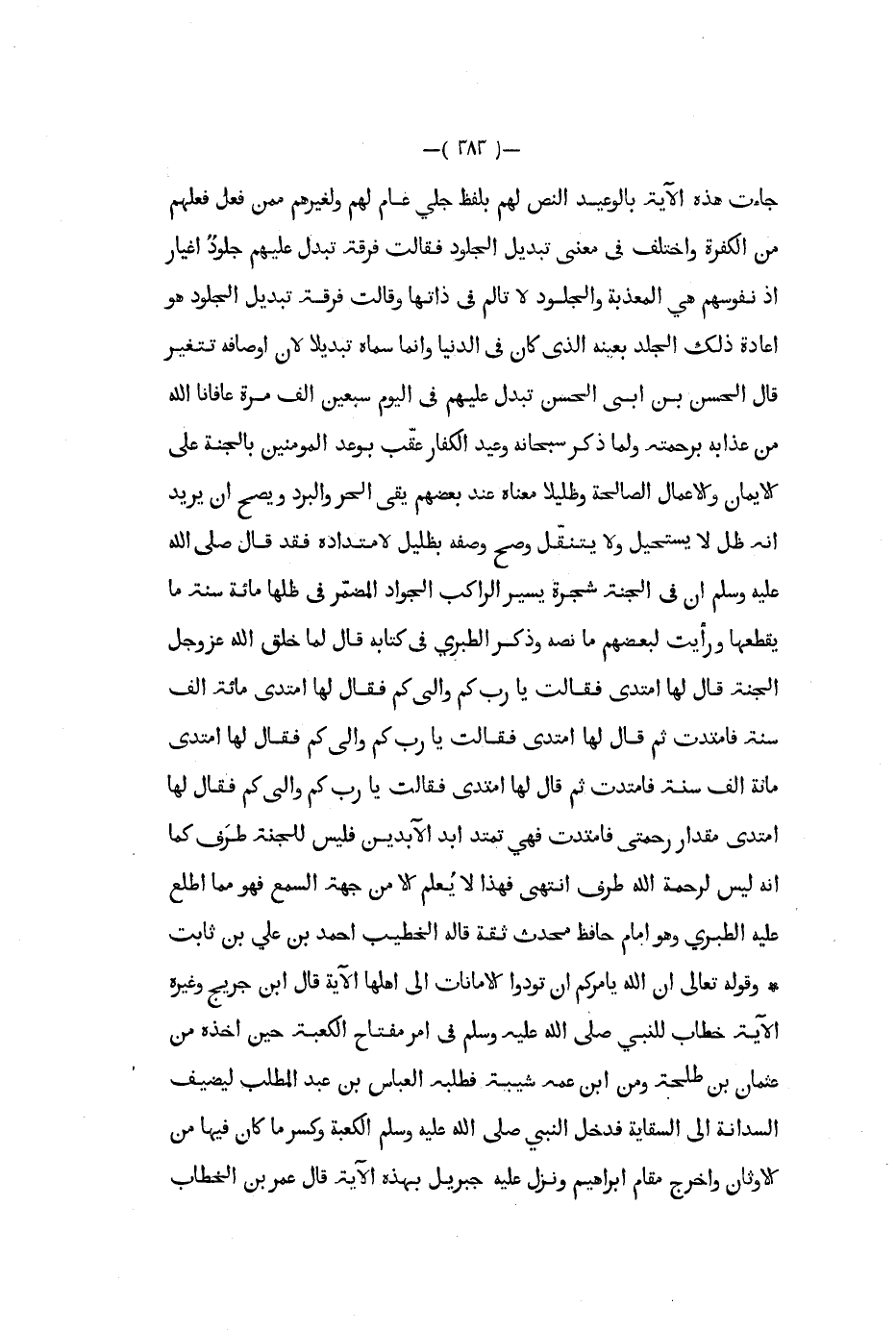 جاءت هذه الآية بالوعيد النص لهم بلفظ جلي عام لهم ولغيرهم ممن فعل فعلهم من الكفرة واختلف في معنى تبديل الجلود فقالت فرقة تبدل عليهم جلود اغيار إذ نفوسهم هي المعذبة والجلود لا تألم في ذاتها وقالت فرقة تبديل الجلود هو إعادة ذلك الجلد بعينه الذي كان في الدنيا إنما سماه تبديلا لأن أوصافه تتغير قال الحسن بن أبي الحسن تبدل عليهم في اليوم سبعين ألف مرة عافانا الله من عذابه برحمته ولما ذكر سبحانه وعيد الكفار عقب بوعد المؤمنين بالجنة على الإيمان والأعمال الصالحة وظليلا معناه عند بعضهم يقي الحر والبرد ويصح ان يريد أنه ظل لا يستحيل ولا يتنقل وصح وصفه بظليل لامتداده فقد قال صلى الله عليه و سلم ان في الجنة شجرة يسير الراكب الجواد المضمر في ظلها مائة سنة ما يقطعها ورأيت لبعضهم ما نصه وذكر الطبري في كتابه قال لما خلق الله عز و جل الجنة قال لها امتدي فقالت يا رب كم وإلى كم فقال لها امتدي مائة ألف سنة فامتدت ثم قال لها امتدي فقالت يا رب كم وإلى كم فقال امتدي مائة ألف سنة فامتدت ثم قال لها امتدي فقالت يا رب كم وإلى كم فقال لها امتدي مقدار رحمتي فامتدت فهي تمتد ابد الآبدين فليس للجنة طرف كما أنه ليس لرحمة الله طرف انتهى فهذا لا يعلم إلا من جهة السمع فهو مما اطلع عليه الطبري وهو إمام حافظ محدث ثقة قاله الخطيب أحمد بن علي بن ثابت وقوله تعالى إن الله يأمركم أن تؤدوا الأمانات إلى أهلها الآية قال ابن جريج وغيره الآية خطاب للنبي صلى الله عليه و سلم في أمر مفتاح الكعبة حين أخذه من عثمان بن طلحة ومن ابن عمه شيبة فطلبه العباس بن عبد المطلب ليضيف السدانة إلى السقاية دخل البني صلى الله عليه و سلم الكعبة وكسر ما كان فيها من الأوثان وأخرج مقام إبراهيم ونزل عليه جبريل بهذه الآية قال عمر بن الخطاب