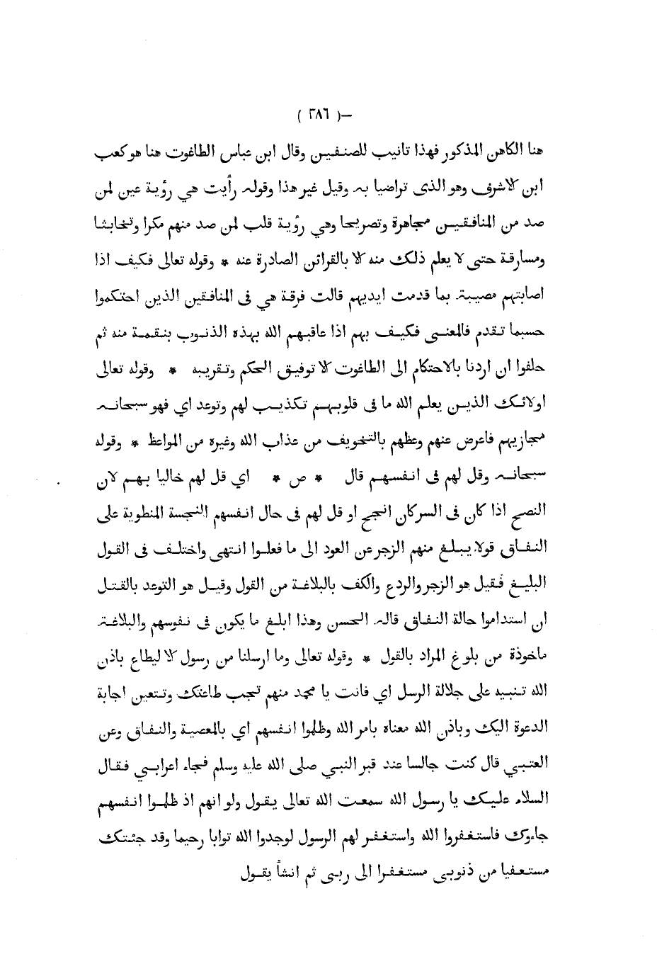 هنا الكاهن المذكور فهذا تأنيب للصنفين وقال ابن عباس الطاغوت هنا هو كعب ابن الأشرف وهو الذي تراضيا به وقيل غير هذا وقوله رأيت هي رؤية عين لمن صد من المنافقين مجاهرة وتصريحا وهي رؤية قلب لمن صد منهم مكرا وتخابثا ومسارقة حتى لا يعلم ذلك منه إلا بالقرائن الصادرة عنه وقوله تعالى فكيف إذا أصابتهم مصيبة بما قدمت أيديهم قالت فرقة هي في المنافقين الذين احتكموا حسبما تقدم فالمعنى فكيف بهم إذا عاقبهم الله بهذه الذنوب بنقمة منه ثم حلفوا إن أرادنا بالاحتكام إلى الطاغوت إلا توفيق الحكم وتقريبه وقوله تعالى اولائك الذين يعلم الله ما في قلوبهم تكذيب لهم وتوعد أي فهو سبحانه مجازيهم فأعرض عنهم وعظهم بالتخويف من عذاب الله وغيره من المواعظ وقوله سبحانه وقل لهم في أنفسهم قال ص أي قل لهم خاليا بهم لأن النصح إذا كان في السر كان أنجح أو قل لهم في حال أنفسهم النجسة المنطوية على النفاق قولا يبلغ منهم الزجر عن العود إلى ما فعلوا انتهى واختلف في القول البليغ فقيل هو الزجر والردع والكف بالبلاغة من القول وقيل هو التوعد بالقتل إن استداموا حالة النفاق قاله الحسن وهذا أبلغ ما يكون في نفوسهم والبلاغة مأخوذة من بلوغ المراد بالقول وقوله تعالى وما أرسلنا من رسول إلا ليطاع بإذن الله تنبيه على جلالة الرسل أي فأنت يا محمد منهم تجب طاعتك وتتعين إجابة الدعوة إليك وبإذن الله معناه بأمر الله وظلموا أنفسهم أي بالمعصية والنفاق وعن العتبي قال كنت جالسا عند قبر النبي صلى الله عليه و سلم فجاء أعرابي فقال السلام عليك يا رسول الله سمعت الله تعالى يقول ولو أنهم إذ ظلموا أنفسهم جاؤك فاستغفروا الله واستغفر لهم الرسول لوجدوا الله توابا رحيما وقد جئتك مستعفيا من ذنوبي مستغفرا إلى ربي ثم انشأ يقول