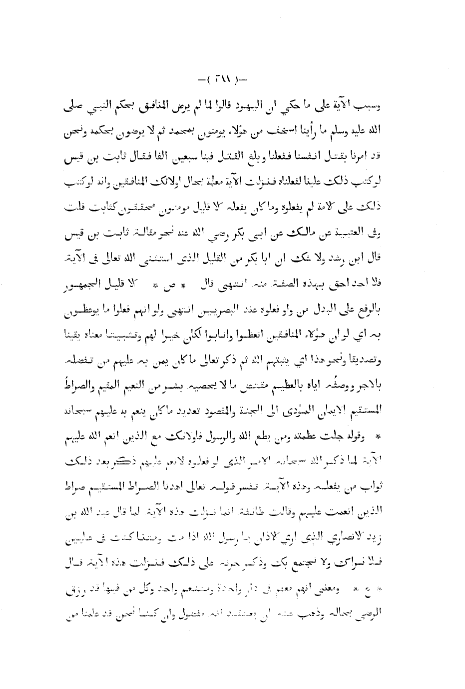 وسبب الاية على ما حكى أن اليهود قالوا لما لم يرض المنافق بحكم النبي صلى الله عليه و سلم ما رأينا أسخف من هؤلاء يؤمنون بمحمد ثم لا يرضون بحكمه ونحن قد أمرنا بقتل أنفسنا ففعلنا وبلغ القتل فينا سبعين ألفا فقال ثابت بن قيس لو كتب ذلك علينا لفعلناه فنزلت الآية معلمة بحال أولئك المنافقين وانه لو كتب ذلك على الأمة لم يفعلوه وما كان يفعله إلا قليل مؤمنون محققون كثابت قلت وفي العتبية عن مالك عن أبي بكر رضي الله عنه نحو مقالة ثابت بن قيس قال ابن رشد ولا شك أن أبا بكر من القليل الذي استثنى الله تعالى في الآية فلا احد أحق بهذه الصفة منه انتهى قال ص إلا قليل الجمهور بالرفع علىالبدل من واو فعلوه عند البصريين انتهى ولو أنهم فعلوا ما يوعظون به أي لو أن هؤلاء المنافقين اتعظوا وأنابوا لكان خيرا لهم وتثبيتا معناه يقينا وتصديقا ونحو هذا أي يثبتهم الله ثم ذكر تعالى ما كان يمن به عليهم من تفضله بالأجر ووصفه إياه بالعظيم مقتض ما لا يحصيه بشر من النعيم المقيم والصراط المستقيم الإيمان المؤدي إلى الجنة والمقصود تعديد ما كان ينعم به عليهم سبحانه وقوله جلت عظمته ومن يطع الله والرسول فأولئك مع الذين أنعم الله عليهم الآية لما ذكر الله سبحانه الأمر الذي لو فعلوه لأنعم عليهم ذكر بعد ذلك ثواب من يفعله وهذه الاية تفسر قوله تعالى اهدنا الصراط المستقيم صراط الذين أنعمت عليهم وقالت طائفة إنما نزلت هذه الاية لما قال عبد الله بن زيد الأنصاري الذي أري الأذان يا رسول الله إذا مت ومتنا كنت في عليين فلا نراك ولا نجتمع بك وذكر حزنه على ذلك فنزلت هذه الآية قال ع ومعنى أنهم معهم في دار واحدة ومتنعم واحد وكل من فيها قد رزق الرضى بحاله وذهب عنه أن يعتقد أنه مفصول وإن كنا نحن قد علمنا من
