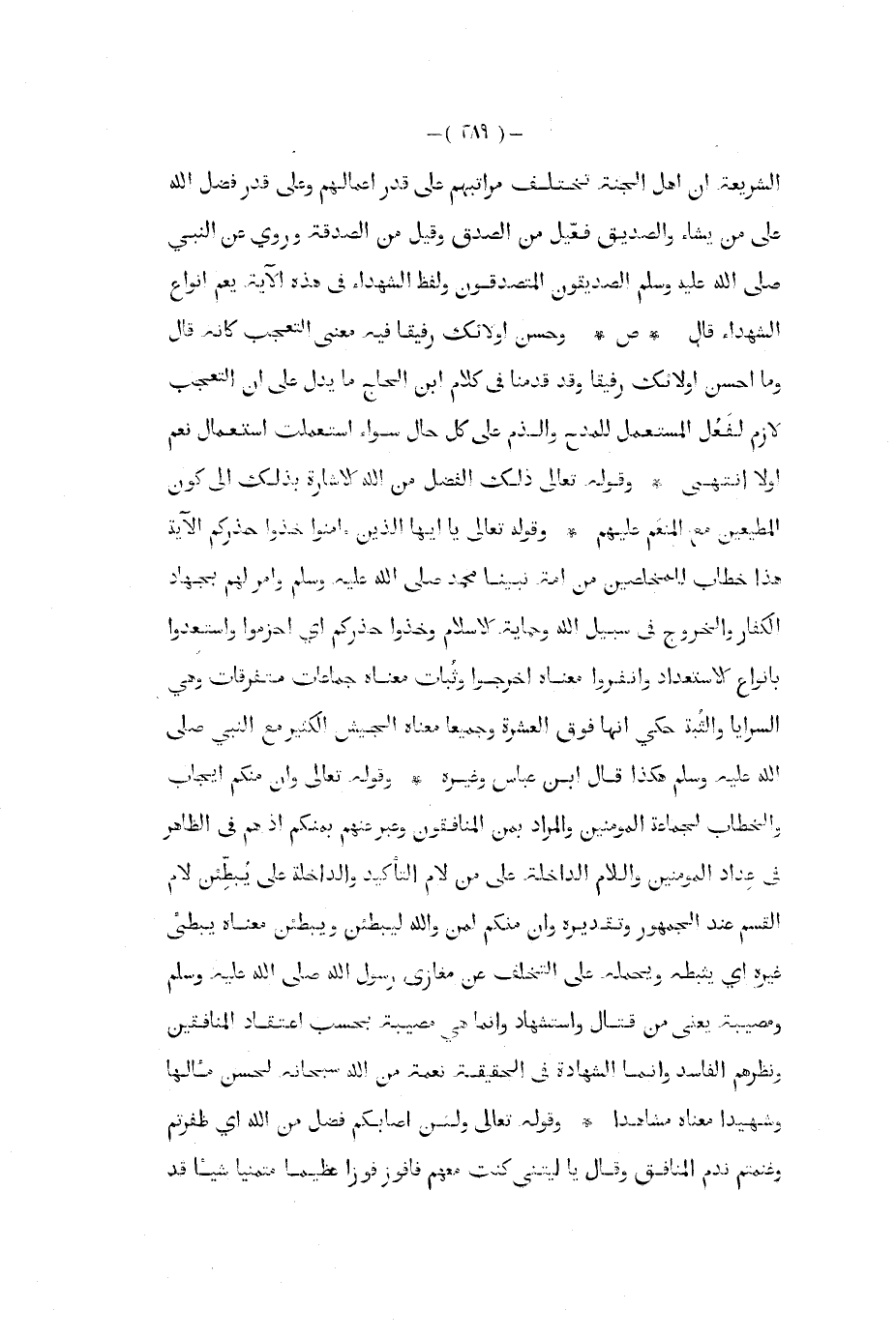 الشريعة أن أهل الجنة تختلف مراتبهم على قدر أعمالهم وعلى قدر فضل الله على من يشاء والصديق فعيل من الصدق وقيل من الصدقة وروي عن النبي صلى الله عليه و سلم الصديقون المتصدقون ولفظ الشهداء في هذه الآية يعم أنواع الشهداء قال ص وحسن اولائك رفيقا فيه معنى التعجب كأنه قال وما أحسن أولئك رفيقا وقد قدمنا في كلام ابن الحاج ما يدل على أن التعجب لازم لفعل المستعمل للمدح والذم على كل حال سواء استعملت استعمال نعم أو لا انتهى وقوله تعالى ذلك الفضل من الله الإشارة بذلك إلى كون المطيعين مع المنعم عليهم وقوله تعالى يا أيها الذين ءامنوا خذوا حذركم الآية هذا خطاب المخلصين من أمة نبينا محمد صلى الله عليه و سلم وأمر لهم بجاهد الكفار والخروج في سبيل الله وحماية الإسلام وخذوا حذركم أي احزموا واستعدوا بأنواع الاستعداد وانفروا معناه اخرجوا وثبات معناه جماعات متفرقات وهي السرايا والثبة حكي أنها فوق العشرة وجميعا معناه الجيش الكثير مع النبي صلى الله عليه و سلم هكذا قال ابن عباس وغيره وقوله تعالى وإن منكم إيجاب والخطاب لجماعةالمؤمنين والمراد بمن المنافقون وعبر عنهم بمنكم إذ هم في الظاهر في عداد المؤمنين واللام الداخلة على من لام التأكيد والداخلة على يبطئن لام القسم عند الجمهور وتقديره وإن منكم لمن والله ليبطئن ويبطئن معناه يبطيء غيره أي يثبطه ويحمله على التخلف عن مغازي رسول الله صلى الله عليه و سلم ومصيبة يعني من قتال واستشهاد وإنما هي مصيبة بحسب اعتقاد المنافقين ونظرهم الفاسد وإنما الشهادة في الحقيقة نعمة من الله سبحانه لحسن مئالها وشهيدا معناه مشاهدا وقوله تعالى ولئن أصابكم فضل من الله أي ظفرتم وغنمتم ندم المنافق وقال يا ليتني كنت معهم فأفوز فوزا عظيما متمنيا شيئا قد
