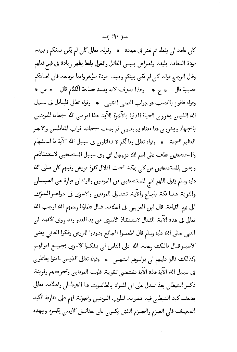 كان عاهد أن يفعله ثم غدر في عهده وقوله تعالى كأن لم يكن بينكم وبينه مودة التفاتة بليغة واعتراض بين القائل والمقول بلفظ يظهر زيادة في قبح فعلهم وقال الزجاج قوله كأن لم يكن بينكم وبينه مودة مؤخر وإنما موضعه فإن أصابكم مصيبة قال ع وهذا ضعيف لأنه يفسد فصاحة الكلام قال ص وقوله فأفوز بالنصب هو جواب التمني انتهى وقوله تعالى فليقاتل في سبيل الله الذين يشرون الحياة الدنيا بالآخرة الآية هذا أمر من الله سبحانه للمؤمنين بالجهاد ويشرون هنا معناه يبيعون ثم وصف سبحانه ثواب المقاتلين والأجر العظيم الجنة وقوله تعالى وما لكم لا تقاتلون في سبيل الله الآية ما استفهام والمستضعفين عطف على اسم الله عز و جل أي وفي سبيل المستضعفين لاستنقاذهم ويعني بالمستضعفين من كان بمكة تحت إذلال كفرة قريش وفيهم كان صلى الله عليه و سلم يقول اللهم أنج المستضعفين من المؤمنين والولدان عبارة عن الصبيان والقرية هنا مكة بإجماع والآية تتناول المؤمنين والأسرى في حواضر الشرك إلى يوم القيامة قال ابن العربي في أحكامه قال علماؤنا رحمهم الله أوجب الله تعالى في هذه الآية القتال لاستنقاذ الأسرى من يد العدو وقد روى الأئمة أن النبي صلى الله عليه و سلم قال أطعموا الجائع وعودوا المريض وفكوا العاني ينعي الأسير قال مالك رحمه الله على الناس أن يفكوا الأسرى بجميع أموالهم وكذلك قالوا عليهم أن يواسوهم انتهى وقوله تعالى الذين ءامنوا يقاتلون في سبيل الله الآية هذه الآية تقتضي تقوية قلوب المؤمنين وتحريضهم وقرينة ذكر الشيطان بعد تدل على أن المراد بالطاغوت هنا الشيطان وإعلامه تعالى بضعف كيد الشيطان فيه تقوية لقلوب المؤمنين وتجرئة لهم على مقارعة الكيد الضعيف فإن العزم والحزم الذي يكون على حقائق الإيمان يكسره ويهده
