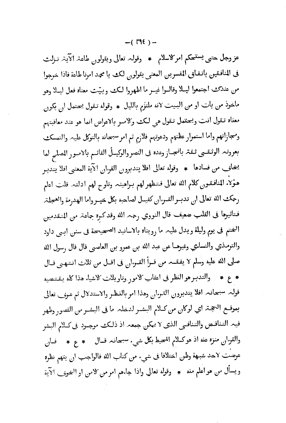 عز و جل حتى يستحكم أمر الإسلام وقوله تعالى ويقولون طاعة الآية نزلت في المنافقين باتفاق المفسرين المعنى يقولون لك يا محمد أمرنا طاعة فإذا خرجوا من عندك اجتمعوا ليلا وقالوا غير ما أظهروا لك وبيت معناه فعل ليلا وهو مأخوذ من بات أو من البيت لأنه ملتزم بالليل وقوله تقول يحتمل أن يكون معناه تقول أنت ويحتمل تقول هي لك والأمر بالإعراض إنما هو عند معاقبتهم ومجازاتهم وأما استمرار عظتهم ودعوتهم فلازم ثم أمر سبحانه بالتوكل عليه والتمسك بعروته الوثقى ثقة بإنجاز وعده في النصر والوكيل القائم بالأمور المصلح لما يخاف من فسادها وقوله تعالى أفلا يتدبرون القرآن الآية المعنى أفلا يتدبر هؤلاء المنافقون كلام الله تعالى فتظهر لهم براهينه وتلوح لهم أدلته قلت اعلم رحمك الله تعالى أن تدبر القرآن كفيل لصاحبه بكل خير وأما الهدرمة والعجلة فتأثيرها في القلب ضعيف قال النووي رحمه الله وقد كره جماعة من المتقدمين الختم في يوم وليلة ويدل عليه ما رويناه بالأسانيد الصحيحة في سنن أبي داود والترمذي والنسائي وغيرها عن عبد الله بن عمرو بن العاص قال قال رسول الله صلى الله عليه و سلم لا يفقه من قرأ القرآن في اقل من ثلاث انتهى قال ع والتدبر هو النظر في أعقاب الأمور وتأويلات الأشياء هذا كله يقتضيه قوله سبحانه أفلا يتدبرون القرآن وهذا أمر بالنظر والاستدلال ثم عرف تعالى بموقع الحجة أي لو كان من كلام البشر لدخله ما في البشر من القصور وظهر فيه التناقض والتنافي الذي لا يمكن جمعه إذ ذلك موجود في كلام البشر والقرآن منزه عنه إذ هو كلام المحيط بكل شيء سبحانه قال ع فإن عرضت لأحد شبهة وظن اختلافا في شيء من كتاب الله فالواجب أن يتهم نظره ويسأل من هو أعلم منه وقوله تعالى وإذا جاءهم أمر من الأمن أو الخوف الآية