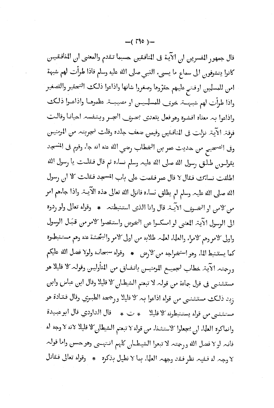 قال جمهور المفسرين أن الآية في المنافقين حسبما تقدم والمعنى أن المنافقين كانوا يتشوفون إلى سماع ما يسيء النبي صلى الله عليه و سلم فإذا طرأت لهم شبهة أمن للمسلمين أو فتح عليهم حقروها وصغروا شأنها وأذاعوا ذلك التحقير والتصغير وإذا طرأت لهم شبهة خوف للمسلمين أو مصيبة عظموها وأذاعوا ذلك وأذاعوا به معناه أفشوه وهو فعل يتعدى بحرف الجر وبنفسه أحيانا وقالت فرقة الاية نزلت في المنافقين وفيمن ضعف جلده وقلت تجربته من المؤمنين وفي الصحيح من حديث عمر بن الخطاب رضي الله عنه أنه جاء وقوم في المسجد يقولون طلق رسول الله صلى الله عليه و سلم نساءه ثم قال فقلت يا رسول الله أطلقت نساءك فقال لا قال عمر فقمت على باب المسجد فقلت ألا إن رسول الله صلى الله عليه و سلم لم يطلق نساءه فأنزل الله تعالى هذه الآية وإذ جاءهم أمر من الأمن أو الخوف الآية قال وأنا الذي استنبطته وقوله تعالى ولو ردوه إلى الرسول الآية المعنى لو أمسكوا عن الخوض واستقصوا الأمر من قبل الرسول وأولي الأمر وهم الأمراء والعلماء لعلمه طلابه من أولي الأمر والبحثة عنه وهم مستنبطوه كما يستنبط الماء وهو استخراجه من الأرض وقوله سبحانه ولولا فضل الله عليكم ورحمته الآية خطاب لجميع المؤمنين باتفاق من المتأولين وقوله إلا قليلا هو مستنثى في قول جماعة من قوله لا تبعتم الشيطان إلا قليلا وقال ابن عباس وابن زيد ذلك مستثنى من قوله اذاعوا به إلا قليلا ورجحه الطبري وقال قتادة هو مستثنى من قوله يستنبطونه إلا قليلا ت قال الداودي قال أبو عبيدة وإنما كره العلماء أن يجعلوا الاستثناء من قوله لاتبعتم الشيطان إلا قليلا لأنه لا وجه له فإنه لولا فضل الله ورحمته لاتبعوا الشيطان كلهم انتهى وهو حسن وأما قوله لا وجه له ففيه نظر فقد وجهه العلماء بما لا نطيل بذكره وقوله تعالى فقاتل
