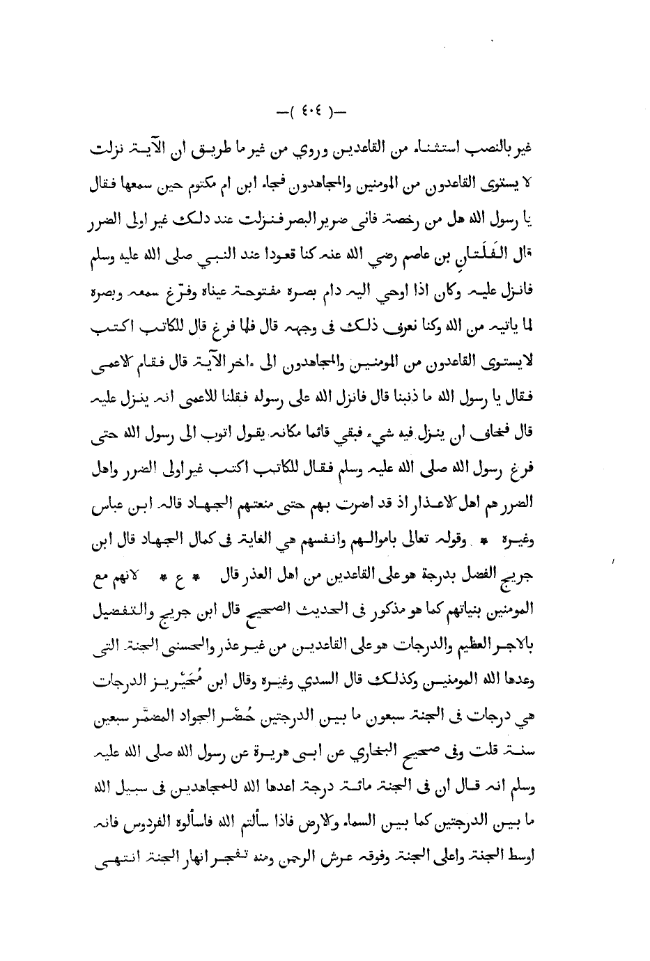غير بالنصب استثناء من القاعدين وروي من غير ما طريق أن الآية نزلت لا يستوى القاعدون من المؤمنين والمجاهدون فجاء ابن أم مكتوم حين سمعها فقال يا رسول الله هل من رخصة فإنى ضرير البصر فنزلت عند ذلك غير أولى الضرر قال الفلتان بن عاصم رضي الله عنه كنا قعودا عند النبي صلى الله عليه و سلم فانزل عليه وكان إذا اوحي اليه دام بصره مفتوحة عيناه وفرغ سمعه وبصره لما يأتيه من الله وكنا نعرف ذلك في وجهه قال فلما فرغ قال للكاتب اكتب لا يستوى القاعدون من المؤمنين والمجاهدون إلى أخر الآية قال فقام الأعمى فقال يا رسول الله ما ذنبنا قال فأنزل الله على رسوله فقلنا للاعمى أنه ينزل عليه قال فخاف أن ينزل فيه شيء فبقي قائما مكانه يقول اتوب إلى رسول الله حتى فرغ رسول الله صلى الله عليه و سلم فقال للكاتب اكتب غير أولى الضرر وأهل الضرر هم اهل الاعذار إذ قد اضرت بهم حتى منعتهم الجهاد قاله ابن عباس وغيره وقوله تعالى بأموالهم وانفسهم هي الغاية في كمال الجهاد قال ابن جريج الفضل بدرجة هو على القاعدين من اهل العذر قال ع لانهم مع المؤمنين بنياتهم كما هو مذكور في الحديث الصحيح قال ابن جريج والتفضيل بالاجر العظيم والدرجات هو على القاعدين من غير عذر والحسنى الجنة التي وعدها الله المؤمنين وكذلك قال السدي وغيره وقال ابن محيريز الدرجات هي درجات في الجنة سبعون ما بين الدرجتين حضر الجواد المضمر سبعين سنة قلت وفي صحيح البخاري عن أبي هريرة عن رسول الله صلى الله عليه و سلم أنه قال أن في الجنة مائة درجة اعدها الله للمجاهدين في سبيل الله ما بين الدرجتين كما بين السماء والأرض فاذا سألتم الله فاسألوه الفردوس فأنه اوسط الجنة واعلى الجنة وفوفه عرش الرحمن ومنه تفجر انهار الجنة انتهى