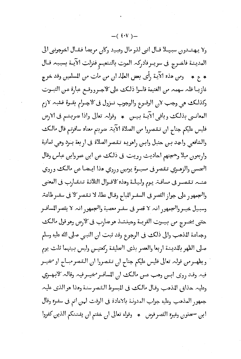 ولا يهتدون سبيلا قال اني لذو مال وعبيد وكان مريضا فقال أخرجوني إلى المدينة فأخرج في سرير فأدركه الموت بالتنعيم فنزلت الآية بسببه قال ع ومن هذه الآية رأى بعض العلماء أن من مات من المسلمين وقد خرج غازيا فله سهمه من الغنيمة قاسوا ذلك على الاجر ووقع عبارة عن الثبوت وكذلك هي وجب لان الوقوع والوجوب نزول في الاجرام بقوة فشبه لازم المعاني بذلك وباقي الآية بين وقوله تعالى وإذا ضربتم في الأرض فليس عليكم جناح أن تقصروا من الصلاة الآية ضربتم معناه سافرتم قال مالك والشافعي وأحمد بن حنبل وابن راهويه تقصر الصلاة في أربعة برد وهي ثمانية وأربعون ميلا وحجتهم احاديث رويت في ذلك عن ابن عمر وابن عباس وقال الحسن والزهري تقصر في مسيرة يومين وروي هذا أيضا عن مالك وروي عنه تقصر في مسافة يوم وليلة وهذه الاقوال الثلاثة تتقارب في المعنى والجمهور على جواز القصر في السفر المباح وقال عطاء لا تقصر إلا في سفر طاعة وسبيل خير والجمهور أنه لا قصر في سفر معصية والجمهور أنه لا يقصر المسافر حتى يخرج من بيوت القرية وحينئذ هو ضارب في الأرض وهو قول مالك وجماعة المذهب وإلى ذلك في الرجوع وقد ثبت أن النبي صلى الله عليه و سلم صلى الظهر بالمدينة أربعا والعصر بذى الحليفة ركعتين وليس بينهما ثلث يوم ويظهر من قوله تعالى فليس عليكم جناح أن تقصروا أن القصر مباح أو مخير فيه وقد روى ابن وهب عن مالك ان المسافر مخير فيه وقاله الأبهري وعليه حذاق المذهب وقال مالك في المبسوط القصر سنة وهذا هو الذي عليه جمهور المذهب وعليه جواب المدونة بالإعادة في الوقت لمن اتم في سفره وقال ابن سحنون وغيره القصر فرض وقوله تعالى إن خفتم أن يفتنكم الذين كفروا