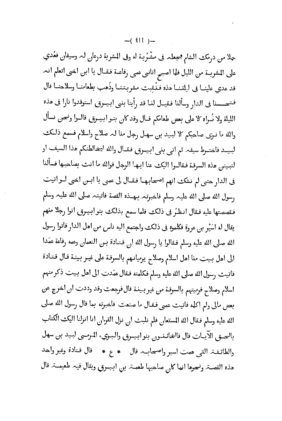 حملا من درمك الشام فجعله في مشربه له وفي المشربة درعان له وسيفان فعدي على المشربة من الليل فلما أصبح أتاني عمى رفاعة فقال يا أبن أخي اتعلم أنه قد عدي علينا في ليلتنا هذه فنقبت مشربتنا وذهب بطعامنا وسلاحنا قال فتحسنا في الدار وسألنا فقيل لنا قد رأينا بني ابيرق استوقدوا نارا في هذه الليلة ولا نراه إلا على بعض طعامكم قال وقد كان بنو ابيرق قالوا ونحن نسأل والله ما نرى صاحبكم إلا لبيد بن سهل رجل منا له صلاح واسلام فسمع ذلك لبيد فأخترط سيفه ثم اتى بنى ابيرق فقال والله ليخالطنكم هذا السيف أو لتبينن هذه السرقة فقالوا اليك عنا أيها الرجل فو الله ما أنت بصاحبها فسألنا في الدار حتى لم نشك أنهم اصحابها فقال لي عمى يا ابن أخي لو أتيت رسول الله صلى الله عليه و سلم فأخبرته بهذه القصة فأتيته صلى الله عليه و سلم فقصصتها عليه فقال انظر في ذلك فلما سمع بذلك بنو ابيرق أتوا رجلا منهم يقال له أسير بن عروة فكلموه في ذلك واجتمع اليه ناس من أهل الدار فأتوا رسول الله ص - فقالوا يا رسول الله إن قتادة بن النعمان وعمه رفاعة عمدا إلى أهل بيت منا أهل إسلام وصلاح يرميانهم بالسرقة على غير بينة قال قتادة فأتيت رسول الله صلى الله عليه و سلم فكلمته فقال عمدت إلى أهل بيت ذكر منهم إسلام وصلاح فرميتهم بالسرقة من غير بينة قال فرجعت وقد وددت أن أخرج عن بعض مالي ولم أكلمه فأتيت عمي فقال ما صنعت فأخبرته بما قال رسول الله صلى الله عليه و سلم فقال الله المستعان فلم نلبث أن نزل القرءان أنا أنزلنا اليك الكتاب بالحق الآيات قال فالخائنون بنو ابيرق والبريء المرمى لبيد بن سهل والطائفة التي همت أسير وأصحابه قال ع قال قتادة وغير واحد هذه القصة ونحوها إنما كان صاحبها طعمة بن ابيرق ويقال فيه طعيمة قال