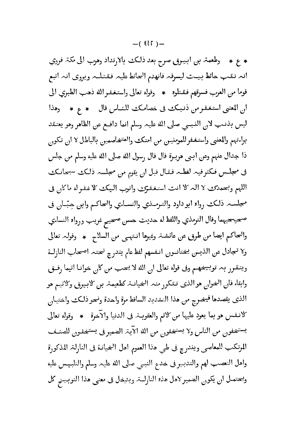 ع وطعمة بن ابيرق صرح بعد ذلك بالارتداد وهرب إلى مكة فروي أنه نقب حائط بيت ليسرقه فأنهدم الحائط عليه فقتله ويروى أنه أتبع قوما من العرب فسرقهم فقتلوه وقوله تعالى واستغفر الله ذهب الطبري إلى أن المعنى استغفر من ذنبك في خصامك للناس قال ع وهذا ليس بذنب لان النبي صلى الله عليه و سلم إنما دافع عن الظاهر وهو يعتقد براءتهم والمعنى واستغفر للمؤمنين من أمتك والمتخاصمين بالباطل لا أن تكون ذا جدال عنهم وعن أبي هريرة قال قال رسول الله صلى الله عليه و سلم من جلس في مجلس فكثر فيه لغطه فقال قبل أن يقوم من مجلسه ذلك سبحانك اللهم وبحمدك لا اله إلا أنت استغفرك وأتوب اليك إلا غفر له ما كان في مجلسه ذلك رواه أبو داود والترمذي والنساءي والحاكم وابن حبان في صحيحيهما وقال الترمذي واللفظ له حديث حسن صحيح غريب ورواه النساءي والحاكم أيضا من طرق عن عائشة وغيرها انتهى من السلاح وقوله تعالى ولا تجادل عن الذين يختانون أنفسهم لفظ عام يندرج تحته أصحاب النازلة ويتقرر به توبيخهم وفي قوله تعالى أن الله لا يحب من كان خوانا أثيما رفق وأبقاء فإن الخوان هو الذى تتكرر منه الخيانة كطعيمة بن الابيرق والاثيم هو الذى يقصدها فيخرج من هذا التشديد الساقط مرة واحدة ونحو ذلك واختيان الانفس هو بما يعود عليها من الاثم والعقوبة في الدنيا والآخرة وقوله تعالى يستخفون من الله الآية الضمير في يستخفون للصنف المرتكب للمعاصي ويندرج في طي هذا العموم أهل الخيانة في النازلة المذكورة وأهل التعصب لهم والتدبير في خدع النبي صلى الله عليه و سلم والتلبيس عليه ويحتمل أن يكون الضمير لأهل هذه النازلة ويدخل في معنى هذا التوبيخ كل