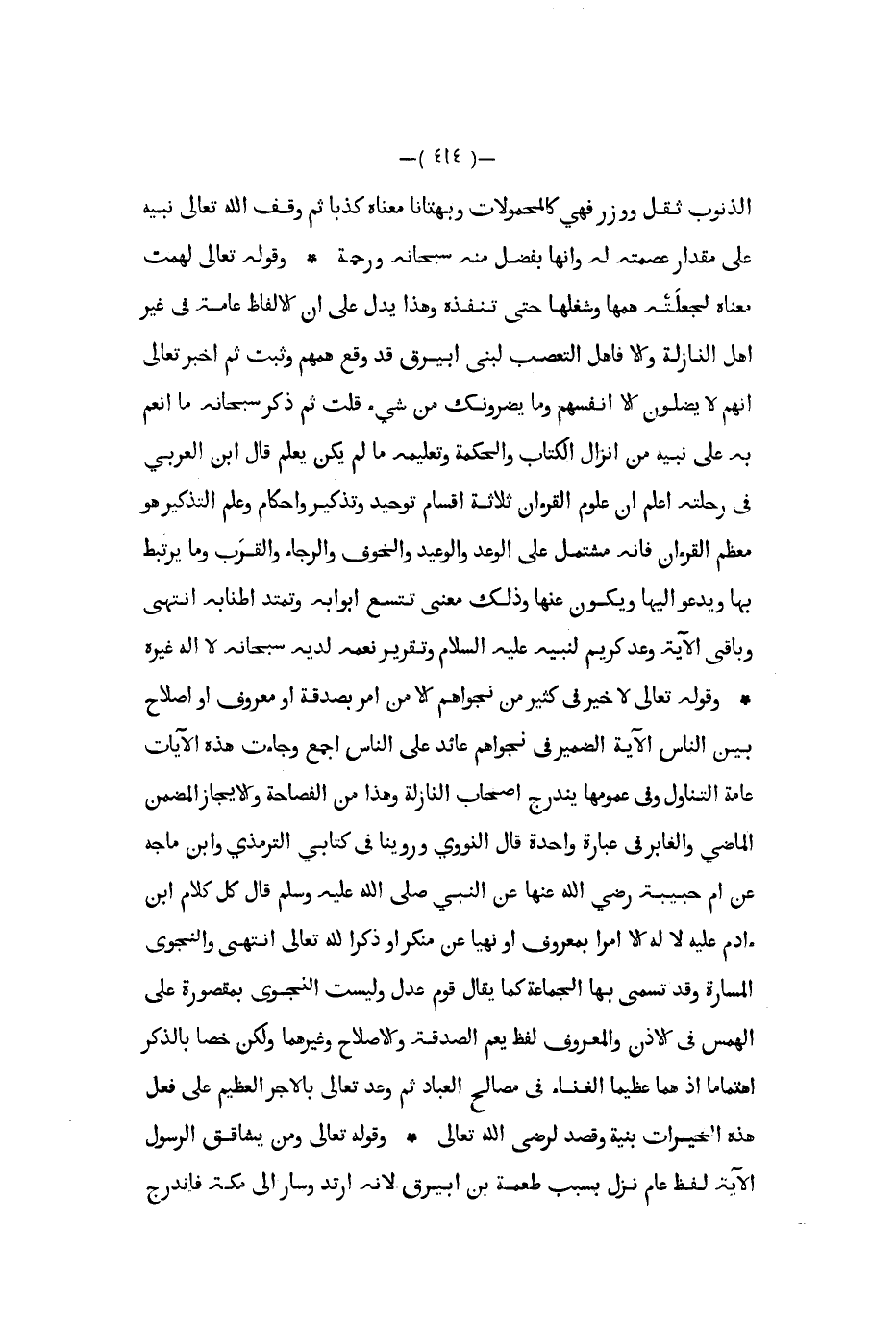 الذنوب ثقل ووزر فهي كالمحمولات وبهتانا معناه كذبا ثم وقف الله تعالى نبيه على مقدار عصمته له وإنها بفضل منه سبحانه ورحمة وقوله تعالى لهمت معناه لجعلته همها وشغلها حتى تنفذه وهذا يدل على أن الالفاظ عامة في غير أهل النازلة وإلا فاهل التعصب لبنى ابيرق قد وقع همهم وثبت ثم أخبرتعالى أنهم لا يضلون إلا انفسهم وما يضرونك من شيء قلت ثم ذكر سبحانه ما انعم به على نبيه من انزال الكتاب والحكمة وتعليمه ما لم يكن يعلم قال ابن العربي في رحلته اعلم ان علوم القرءان ثلاثة اقسام توحيد وتذكير واحكام وعلم التذكير هو معظم القرءان فإنه مشتمل على الوعد والوعيد والخوف والرجاء والقرب وما يرتبط بها ويدعو اليها ويكون عنها وذلك معنى تتسع ابوابه وتمتد اطنابه انتهى وباقي الآية وعد كريم لنبيه عليه السلام وتقرير نعمه لديه سبحانه لا إله غيره وقوله تعالى لا خير في كثير من نجواهم إلا من أمر بصدقة أو معروف أو اصلاح بين الناس الآية الضمير في نجواهم عائد على الناس أجمع وجاءت هذه الآيات عامة التناول وفي عمومها يندرج أصحاب النازلة وهذا من الفصاحة والايجاز المضمن الماضي والغابر في عبارة واحدة قال النووي وروينا في كتابي الترمذي وابن ماجه عن أم حبيبة رضي الله عنها عن النبي صلى الله عليه و سلم قال كل كلام ابن أدم عليه لا له إلا أمرا بمعروف أو نهيا عن منكر أو ذكرا لله تعالى انتهى والنجوى المسارة وقد تسمى بها الجماعة كما يقال قوم عدل وليست النجوى بمقصورة على الهمس في الاذن والمعروف لفظ يعم الصدقة والاصلاح وغيرهما ولكن خصا بالذكر اهتماما إذ هما عظيما الغناء في مصالح العباد ثم وعد تعالى بالاجر العظيم على فعل هذه الخيرات بنية وقصد لرضى الله تعالى وقوله تعالى ومن يشاقق الرسول الآية لفظ عام نزل بسبب طعمة بن ابيرق لانه ارتد وسار إلى مكة فاندرج