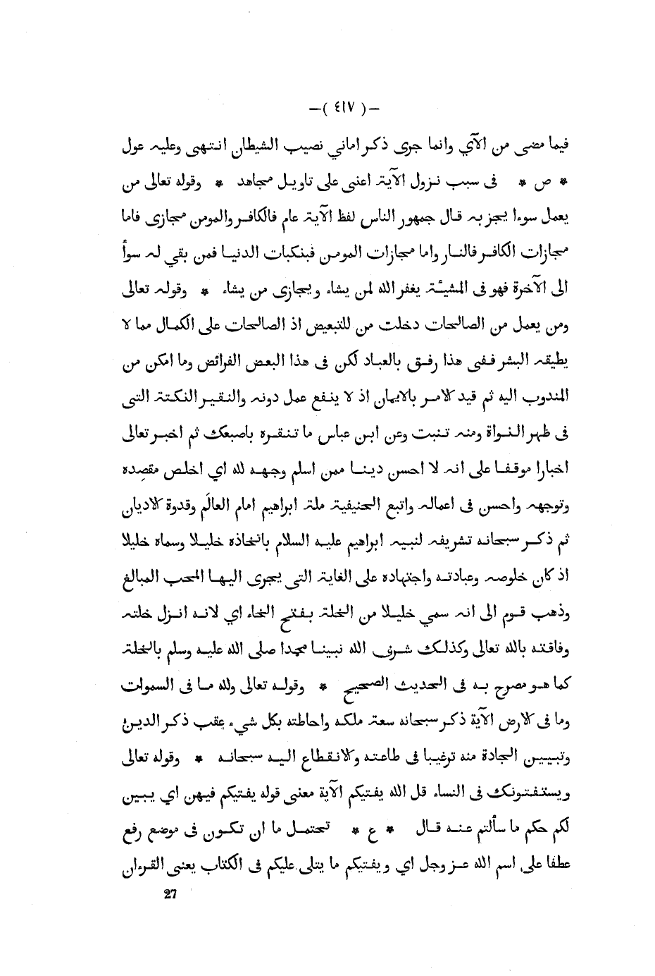 فيما مضى من الآي وإنما جرى ذكر أماني نصيب الشيطان انتهى وعليه عول ص في سبب نزول الآية أعني على تأويل مجاهد وقوله تعالى من يعمل سوءا يجز به قال جمهور الناس لفظ الآية عام فالكافر والمؤمن مجازى فإما مجازات الكافر فالنار وأما مجازات المؤمن فبنكبات الدنيا فمن بقي له سوأ إلى الآخرة فهو في المشيئة يغفر الله لمن يشاء ويجازي من يشاء وقوله تعالى ومن يعمل من الصالحات دخلت من للتبعيض إذ الصالحات على الكمال مما لا يطيقه البشر ففي هذا رفق بالعباد لكن في هذا البعض الفرائض وما أمكن من المندوب إليه ثم قيد الأمر بالإيمان إذ لا ينفع عمل دونه والنقير النكتة التي في ظهر النواة ومنه تنبت وعن ابن عباس ما تنقره بإصبعك ثم أخبر تعالى إخبارا موقفا على أنه لا احسن دينا ممن أسلم وجهه لله أي أخلص مقصده وتوجهه وأحسن في أعماله واتبع الحنيفية ملة إبراهيم إمام العالم وقدوة الأديان ثم ذكر سبحانه تشريفه لنبيه إبراهيم عليه السلام باتخاذه خليلا وسماه خليلا إذ كان خلوصه وعبادته واجتهاده على الغاية التي يجرى إليها المحب المبالغ وذهب قوم إلى أنه سمي خليلا من الخلة بفتح الخاء أي لأنه أنزل خلته وفاقته بالله تعالى وكذلك شرف الله نبينا محمد صلى الله عليه و سلم بالخلة كما هو مصرح به في الحديث الصحيح وقوله تعالى ولله ما في السموات وما في الأرض الآية ذكر سبحانه سعة ملكه وإحاطته بكل شيء عقب ذكر الدين وتبيين الجادة منه ترغيبا في طاعته والانقطاع إليه سبحانه وقوله تعالى ويستفتونك في النساء قل الله يفتيكم الآية معنى قوله يفتيكم فيهن أي يبين لكم حكم ما سألتم عنه قال ع تحتمل ما أن تكون في موضع رفع عطفا على اسم الله عز و جل أي ويفتيكم ما يتلي عليكم في الكتاب يعني القرآن