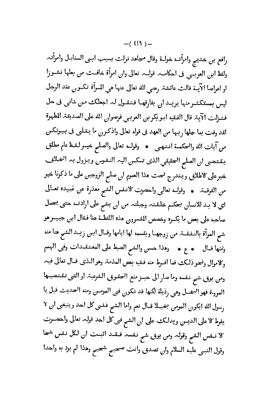رافع بن خديج وامرأته خولة وقال مجاهد نزلت بسبب أبي السنابل وامرأته ولفظ ابن العربي في أحكامه قوله تعالى وإن امرأة خافت من بعلها نشوزا أو إعراضا الآية قالت عائشة رضي الله تعالى عنها هي المرأة تكون عند الرجل ليس بمستكثر منها يريد أن يفارقها فتقول له أجعلك من شأني في حل فنزلت الآية قال الفقيه أبو بكر بن العربي فرضوان الله على الصديقة المطهرة لقد وفت بما حملها ربها من العهد في قوله تعالى واذكرن ما يتلى في بيوتكن من آيات الله والحكمة انتهى وقوله تعالى والصلح خير لفظ عام مطلق يقتضي أن الصلح الحقيقي الذي تسكن إليه النفوس ويزول به الخلاف خير علىالإطلاق ويندرج تحت هذا العموم أن صلح الزوجين على ما ذكرنا خير من الفرقة وقوله تعالى وأحضرت الأنفس الشح معذرة عن عبيده تعالى أي لا بد للإنسان بحكم خلقته وجبلته من أن يشح على إرادته حتى يحمل صاحبه على بعض ما يكره وخصص المفسرون هذه اللفظة هنا فقال ابن جبير هو شح المرأة بالنفقة من زوجها وبقسمه لها أيامها وقال ابن زيد الشح هنا منه ومنها قال ع وهذا حسن والشح الضبط على المعتقدات وفي الهمم والأموال ونحو ذلك فما أفرط منه ففيه بعض المذمة وهو الذي قال تعالى فيه ومن يوق شح نفسه وما صار إلى حيز منع الحقوق الشرعية أو التي تقتضيها المروءة فهو البخل وهي رذيلة لكنها قد تكون في المؤمن ومنه الحديث قيل يا رسول الله أيكون المؤمن بخيلا قال نعم وأما الشح ففي كل أحد وينبغي أن لا يفرط إلى على الدين ويدلك على أن الشح في كل أحد قوله تعالى وأحضرت الأنفس الشح وقوله ومن يوق شح نفسه فقد أثبت أن لكل نفس شحا وقول النبي عليه السلام وان تصدق وأنت صحيح شحيح وهذا لم يرد به واحدا