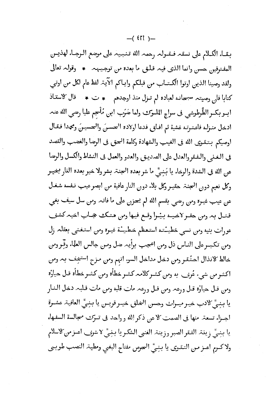 بقاء الكلام على نسقه فقوله رحمه الله تنبيه على موضع الرجاء لهذين المفترقين حسن وإنما الذي فيه قلق ما بعده من توجيهه وقوله تعالى ولقد وصينا الذين أوتوا الكتاب من قبلكم وإياكم الآية لفظ عام لكل من أوتي كتابا فإن وصيته سبحانه لعباده لم تزل منذ أوجدهم ت قال الأستاذ أبو بكر الطرطوشي في سراج الملوك ولما ضرب ابن ملجم عليا رضي الله عنه أدخل منزله فاعترته غشية ثم أفاق فدعا أولاده الحسن والحسين ومحمدا فقال أوصيكم بتقوى الله في الغيب والشهادة وكلمة الحق في الرضا والغضب والقصد في الغنى والفقر والعدل على الصديق والعدو والعمل في النشاط والكسل والرضا عن الله في الشدة والرخاء يا بني ما شر بعده الجنة بشر ولا خير بعده النار بخير وكل نعيم دون الجنة حقير وكل بلاء دون النار عافية من أبصر عيب نفسه شغل عن عيب غيره ومن رضي بقسم الله لم يحزن على ما فاته ومن سل سيف بغي قتل به ومن حفر لأخيه بيرا وقع فيها ومن هتك حجاب أخيه كشف عورات بنيه ومن نسي خطيئته استعظم خطيئة غيره ومن استغنى بعقله زل ومن تكبر على الناس ذل ومن أعجب برأيه ضل ومن جالس العلماء وقر ومن خالط الأنذال احتقر ومن دخل مداخل السوء اتهم ومن مزح استخف به ومن أكثر من شيء عرف به ومن كثر كلامه كثر خطأه ومن كثر خطأه قل حياؤه ومن قل حياؤه قل ورعه ومن قل ورعه مات قلبه ومن مات قلبه دخل النار يا بني الأدب خير ميراث وحسن الخلق خير قرين يا بني العافية عشرة أجزاء تسعة منها في الصمت إلا عن ذكر الله وواحد في ترك مجالسة السفهاء يا بني زينة الفقر الصبر وزينة الغنى الشكر يا بني لا شرف أعز من الإسلام ولا كرم أعز من التقوى يا بني الحرص مفتاح البغي ومطية النصب طوبى