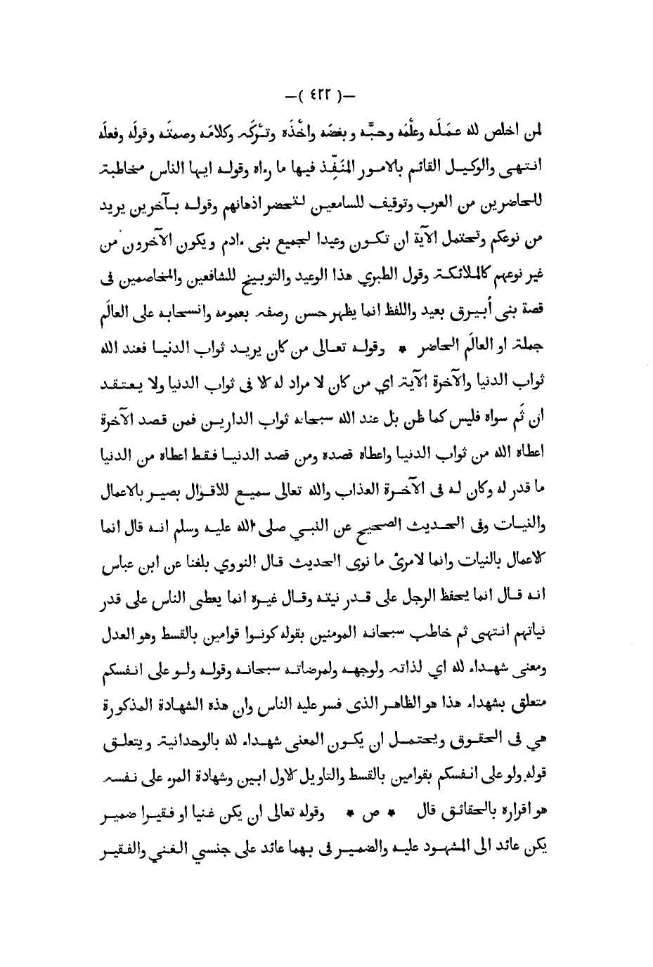 لمن أخلص لله عمله وعلمه وحبه وبغضه وأخذه وتركه وكلامه وصمته وقوله وفعله انتهى والوكيل القائم بالأمور المنفذ فيها ما رآه وقوله أيها الناس مخاطبة للحاضرين من العرب وتوقيف للسامعين لتحضر أذهانهم وقوله بآخرين يريد من نوعكم وتحتمل الآية أن تكون وعيد لجميع بني آدم ويكون الآخرون من غير نوعهم كالملائكة وقول الطبري هذا الوعيد والتوبيخ للشافعين والمخاصمين في قصة بني أبيرق بعيد واللفظ إنما يظهر حسن رصفه بعمومه وانسحابه على العالم جملة أو العالم الحاضر وقوله تعالى من كان يريد ثواب الدنيا فعند الله ثواب الدنيا والآخرة الآية أي من كان لا مراد له إلا في ثواب الدنيا لا يعتقد أن ثم سواه فليس كما ظن بل عند الله سبحانه ثواب الدارين فمن قصد الآخرة أعطاه الله من ثواب الدنيا وأعطاه قصده ومن قصد الدنيا فقط أعطاه من الدنيا ما قدر له وكان له في الآخرة العذاب والله تعالى سميع للأقوال بصير بالأعمال والنيات وفي الحديث الصحيح عن النبي صلى الله عليه و سلم أنه قال إنما الأعمال بالنيات وإنما لامرىء ما نوى الحديث قال النووي بلغنا عن ابن عباس أنه قال إنما يحفظ الرجل على قدر نيته وقال غيره إنما يعطى الناس على قدر نياتهم انتهى ثم خاطب سبحانه المؤمنين بقوله كونوا قوامين بالقسط وهو العدل ومعنى شهداء لله أي لذاته ولوجهه ولمرضاته سبحانه وقوله ولو على أنفسكم متعلق بشهداء هذا هو الظاهر الذي فسر عليه الناس وإن هذه الشهادة المذكورة هي في الحقوق ويحتمل ان يكون المعنى شهداء لله بالوحدانية ويتعلق قوله ولو على أنفسكم بقوامين بالقسط والتأويل الأول أبين وشهادة المرء على نفسه هو إقراره بالحقائق قال ص وقوله تعالى إن يكن غنيا أو فقيرا ضمير يكن عائد إلى المشهود عليه والضمير في بهما عائد على جنسي الغني والفقير