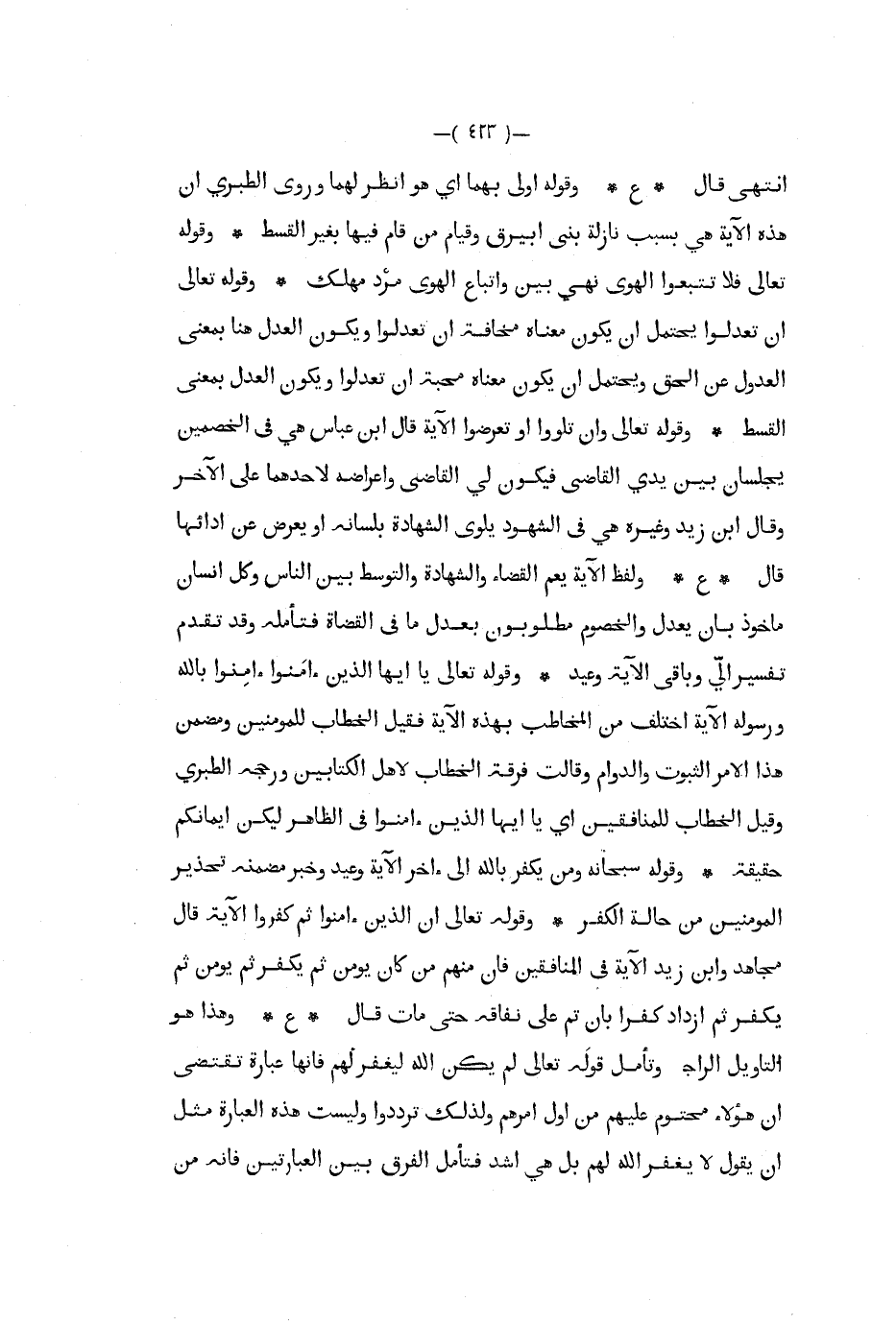 انتهى قال ع وقوله أولى بهما أي هو انظر لهما وروى الطبري أن هذه الآية هي بسبب نازلة بني أبيرق وقيام من قام فيها بغير القسط وقوله تعالى فلا تتبعوا الهوى نهي بين واتباع الهوى مرد مهلك وقوله تعالى إن تعدلوا يحتمل أن يكون معناه مخافة أن تعدلوا ويكون العدل هنا بمعنى العدول عن الحق ويحتمل أن يكون معناه محبة أن تعدلوا ويكون العدل بمعنى القسط وقوله تعالى وإن تلووا أو تعرضوا الآية قال ابن عباس هي في الخصمين يجلسان بين يدي القاضي فيكون لي القاضي وإعراضه لأحدهما على الآخر وقال ابن زيد وغيره هي في الشهود يلوى الشهادة بلسانه أو يعرض عن أدائها قال ع ولفظ الآية يعم القضاء والشهادة والتوسط بين الناس وكل إنسان مأخوذ بأن يعدل والخصوم مطلوبون بعدل ما في القضاة فتأمله وقد تقدم تفسير إلى وباقي الآية وعيد وقوله تعالى يا أيها الذين آمنوا آمنوا بالله ورسوله الآية اختلف من المخاطب بهذه الآية فقيل الخطاب للمؤمنين ومضمن هذا الأمر الثبوت والدوام وقالت فرقة الخطاب لأهل الكتابين ورجحه الطبري وقيل الخطاب للمنافقين أي يا أيها الذين آمنوا في الظاهر ليكن إيمانكم حقيقة وقوله سبحانه ومن يكفر بالله إلى آخر الآية وعيد وخبر مضمنه تحذير المؤمنين من حالة الكفر وقوله تعالى إن الذين ءامنوا ثم كفروا الآية قال مجاهد وابن زيد الآية في المنافقين فإن منهم من كان يؤمن ثم يكفر ثم يؤمن ثم يكفر ثم ازداد كفرا بأن تم على نفاقه حتى مات قال ع وهذا هو التأويل الراجح وتأمل قوله تعالى لم يكن الله ليغفر لهم فإنها عبارة تقتضي أن هؤلاء محتوم عليهم من أول أمرهم ولذلك ترددوا وليست هذه العبارة مثل أن يقول لا يغفر الله لهم بل هي أشد فتأمل الفرق بين العبارتين فإنه من