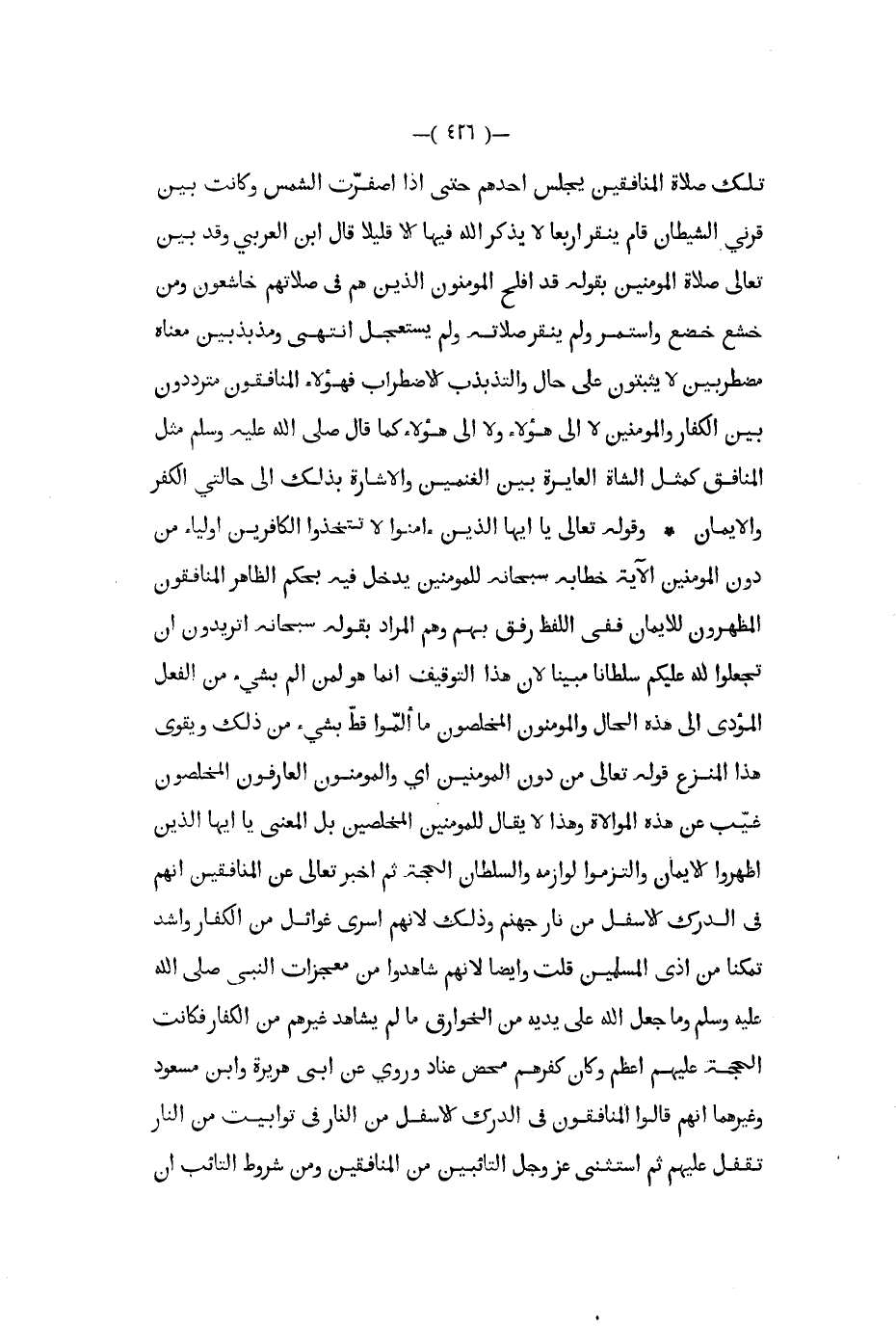تلك صلاة المنافقين يجلس أحدهم حتى إذا اصفرت الشمس وكانت بين قرني الشيطان قام ينقر أربعا لا يذكر الله فيها إلا قليلا قال ابن العربي وقد بين تعالى صلاة المؤمنين بقوله قد أفلح المؤمنون الذين هم في صلاتهم خاشعون ومن خشع خضع واستمر ولم ينقر صلاته ولم يستعجل انتهى ومذبذبين معناه مضطرين لا يثبتون على حال والتذبذب الاضطراب فهؤلاء المنافقون مترددون بين الكفار والمؤمنين لا إلى هؤلاء ولا إلى هؤلاء كما قال صلى الله عليه و سلم مثل المنافقين كمثل الشاة العايرة بين الغنمين والإشارة بذلك إلى حالتي الكفر والإيمان وقوله تعالى يا أيها الذين ءامنوا لا تتخذوا الكافرين أولياء من دون المؤمنين الآية خطابه سبحانه للمؤمنين يدخل فيه بحكم الظاهر المنافقون المظهرون للإيمان ففي اللفظ رفق بهم وهم المراد بقوله سبحانه أترديون أن تجعلوا لله عليكم سلطانا مبينا لأن هذا التوقيف إنما هو لمن ألم يشيء من الفعل المؤدي إلى هذه الحال والمؤمنون المخلصون ما ألموا قط بشيء من ذلك ويقوى هذا المنزع قوله تعالى من دون المؤمنين اي والمؤمنون العارفون المخلصون غيب عن هذه الموالاة وهذا لا يقال للمؤمنين المخلصين بل المعنى يا أيها الذين أظهروا الإيمان والتزموا لوازمه والسلطان الحجة ثم أخبر تعالى عن المنافقين أنهم في الدرك الأسفل من نار جهنم وذلك لأنهم أسرى غوائل من الكفار واشد تمكنا من أذى المسلمين قلت وأيضا لأنهم شاهدوا من معجزات النبي صلى الله عليه و سلم وما جعل الله على يديه من الخوارق ما لم يشاهد غيرهم من الكفار فكانت الحجة عليهم أعظم وكان كفرهم محض عناد وروي عن أبي هريرة وابن مسعود وغيرهما أنهم قالوا المنافقون في الدرك الأسفل من النار في توابيت من النار تقفل عليهم ثم استثنى عز و جل التائبين من المنافقين ومن شروط التائب أن