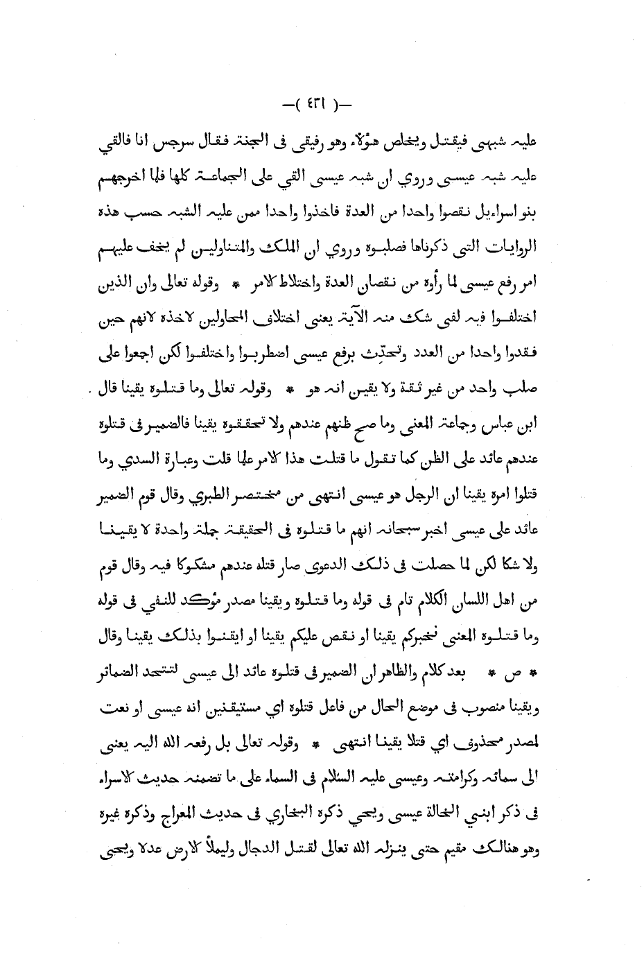 عليه شبهى فيقتل ويخلص هؤلاء وهو رفيقي في الجنة فقال سرجس أنا فالقي عليه شبه عيسى وروي أن شبه عيسى ألقي على الجماعة كلها فلما أخرجهم بنو إسرائيل نقصوا واحدا من العدة فأخذوا واحدا ممن عليه الشبه حسب هذه الروايات التي ذكرناها فصلبوه وروي أن الملك والمتناولين لم يخف عليهم أمر رفع عيسى لما رأوه من نقصان العدة واختلاط الأمر وقوله تعالى وإن الذين اختلفوا فيه لفي شك منه الآية يعني اختلاف المحاولين لأخذه لأنهم حين فقدوا واحدا من العدد وتحدث برفع عيسى اضطربوا واختلفوا لكن أجمعوا على صلب واحد من غير ثقة ولا يقين أنه هو وقوله تعالى وما قتلوه يقينا قال ابن عباس وجماعة المعنى وما صح ظنهم عندهم ولا تحققوه يقينا فالضمير في قتلوه عندهم عائد على الظن كما تقول ما قتلت هذا الأمر علما قلت وعبارة السدي وما قتلوا أمره يقينا أن الرجل هو عيسى انتهى من مختصر الطبري وقال قوم الضمير عائد على عيسى أخبر سبحانه أنهم ما قتلوه في الحقيقة جملة واحدة لا يقينا ولا شكا لكن لما حصلت في ذلك الدعوى صار قتله عندهم مشكوكا فيه وقال قوم من أهل اللسان الكلام تام في قوله وما قتلوه ويقينا مصدر مؤكد للنفي في قوله وما قتلوه المعنى نخبركم يقينا أو نقص عليكم يقينا أو أيقنوا بذلك يقينا وقال ص بعد كلام والظاهر أن الضمير في قتلوه عائد إلى عيسى لتتحد الضمائر ويقينا منصوب في موضع الحال من فاعل قتلوه أي مستيقنين أنه عيسى أو نعت لمصدر محذوف أي قتلا يقينا انتهى وقوله تعالى بل رفعه الله إليه يعني إلى سمائه وكرامته وعيسى عليه السلام في السماء على ما تضمنه حديث الإسراء في ذكر ابني الخالة عيسى ويحيى ذكره البخاري في حديث المعراج وذكره غيره وهو هنالك مقيم حتى ينزله الله تعالى لقتل الدجال وليملأ الأرض عدلا ويحيى