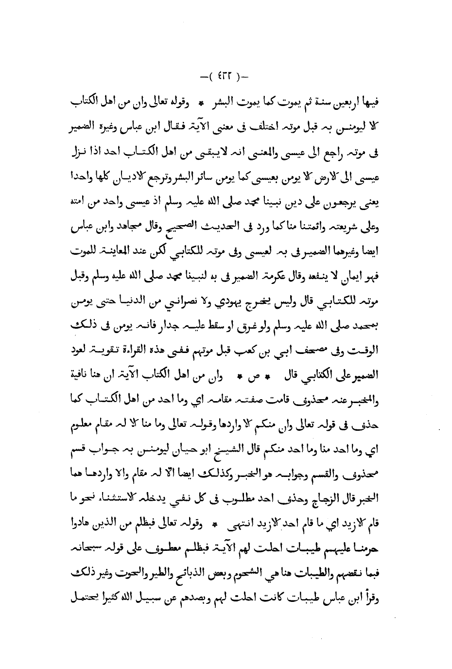 فيها أربعين سنة ثم يموت كما يموت البشر وقوله تعالى وإن من أهل الكتاب إلا ليؤمنن به قبل موته اختلف في معنى الآية فقال ابن عباس وغيره الضمير في موته راجع إلى عيسى والمعنى أنه لا يبقى من أهل الكتاب أحد إذا نزل عيسى إلى الأرض إلا يؤمن بعيسى كما يؤمن سائر البشر وترجع الأديان كلها واحدا يعني يرجعون على دين نبينا محمد صلى الله عليه و سلم إذ عيسى واحد من أمته وعلى شريعته وائمتنا منا كما ورد في الحديث الصحيح وقال مجاهد وابن عباس أيضا وغيرهما الضمير في به لعيسى وفي موته للكتابي لكن عند المعاينة للموت فهو إيمان لا ينفعه وقال عكرمة الضمير في به لنبينا محمد صلى الله عليه و سلم وقبل موته للكتابي قال وليس يخرج يهودي ولا نصراني من الدنيا حتى يؤمن بمحمد صلى الله عليه و سلم ولو غرق أو سقط عليه جدار فإنه يؤمن في ذلك الوقت وفي مصحف أبي بن كعب قبل موتهم ففي هذه القراءة تقوية لعود الضمير على الكتابي قال ص وإن من أهل الكتاب الآية إن هنا نافية والمخبر عنه محذوف قامت صفته مقامه أي وما أحد من أهل الكتاب كما حذف في قوله تعالى وإن منكم إلا واردها وقوله تعالى وما منا إلا له مقام معلوم أي وما أحد منا وما أحد منكم قال الشيخ أبو حيان ليؤمنن به جواب قسم محذوف والقسم وجوابه هو الخبر وكذلك أيضا إلا له مقام وإلا واردها هما الخبر قال الزجاج وحذف أحد مطلوب في كل نفي يدخله الاستثناء نحو ما قام إلا زيد أي ما قام أحد إلا زيد انتهى وقوله تعالى فبظلم من الذين هادوا حرمنا عليهم طيبات أحلت لهم الآية فبظلم معطوف على قوله سبحانه فبما نقضهم والطيبات هنا هي الشحوم وبعض الذبائح والطير والحوت وغير ذلك وقرأ ابن عباس طيبات كانت أحلت لهم وبصدهم عن سبيل الله كثيرا يحتمل