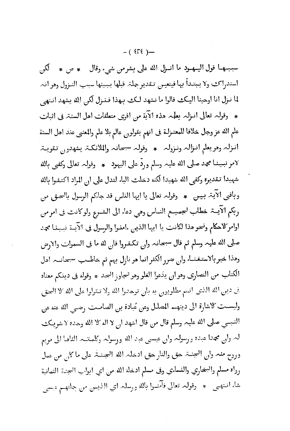 سببها قول اليهود ما أنزل الله على بشر من شيء وقال ص لكن استدراك ولا يبتدأ بها فيتعين تقدير جملة قبلها يبينها سبب النزول وهو أنه لما نزل انا أوحينا إليك قالوا ما نشهد لك بهذا فنزل لكن الله يشهد انتهى وقوله تعالى أنزله بعلمه هذه الآية من أقوى متعلقات أهل السنة في إثبات علم الله عز و جل خلافا للمعتزلة في أنهم يقولون عالم بلا علم والمعنى عند أهل السنة انزله وهو يعلم إنزاله ونزوله وقوله سبحانه والملائكة يشهدون يشهدون تقوية لأمر نبينا محمد صلى الله عليه و سلم ورد على اليهود وقوله تعالى وكفى بالله شهيدا تقديره وكفى الله شهيدا لكنه دخلت الباء لتدل على أن المراد اكتفوا بالله وباقي الآية بين وقوله تعالى يا أيها الناس قد جاءكم الرسول بالحق من ربكم الآية خطاب لجميع الناس وهي دعاء إلى الشرع ولو كانت في أمر من أوامر الأحكام ونحو هذا لكانت يا أيها الذين أمنوا والرسول في الآية نبينا محمد صلى الله عليه و سلم ثم قال سبحانه وإن تكفروا فإن لله ما في السموات والأرض وهذا خبر بالاستغناء وإن ضرر الكفر إنما هو نازل بهم ثم خاطب سبحانه أهل الكتاب من النصارى وهو أن يدعوا الغلو وهو تجاوز الحد وقوله في دينكم معناه في دين الله الذي انتم مطلوبون به بأن توحدوا الله ولا تقولوا على الله إلا الحق وليست الإشارة إلى دينهم المضلل وعن عبادة بن الصامت رضي الله عنه عن النبي صلى الله عليه و سلم قال من قال أشهد أن لا إله إلا الله وحده لا شريك له وأن محمد عبده ورسوله وأن عيسى عبد الله ورسوله وكلمته ألقاها إلى مريم وروح منه وأن الجنة حق والنار حق أدخله الله الجنة على ما كان من عمل رواه مسلم والبخاري والنسائي وفي مسلم أدخله الله من أي أبواب الجنة الثمانية شاء انتهى وقوله تعالى فآمنوا بالله ورسله أي الذين من جملتهم عيسى