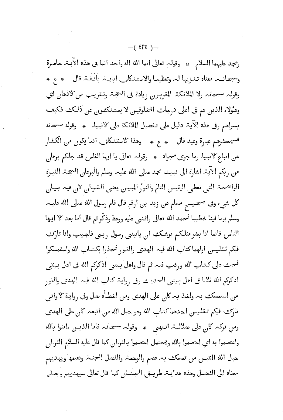 ومحمد عليهما السلام وقوله تعالى إنما الله إله واحد إنما في هذه الآية حاصرة وسبحانه معناه تنزيها له وتعظيما والاستنكاف اباية بأنفة قال ع وقوله سبحانه ولا الملائكة المقربون زيادة في الحجة وتقريب من الأذهان أي وهؤلاء الذين هم في أعلى درجات المخلوقين لا يستنكفون عن ذلك فكيف بسواهم وفي هذه الآية دليل على تفضيل الملائكة على الأنبياء وقوله سبحانه فسيحشرهم عبارة وعيد قال ع وهذا الاستنكاف إنما يكون من الكفار عن اتباع الأنبياء وما جرى مجراه وقوله تعالى يا أيها الناس قد جاءكم برهان من ربكم الآية إشارة إلى نبينا محمد صلى الله عليه و سلم والبرهان الحجة النيرة الواضحة التي تعطي اليقين التام والنور المبين يعني القرآن لأن فيه بيان كل شيء وفي صحيح مسلم عن زيد بن أرقم قال قام رسول الله صلى الله عليه و سلم يوما فينا خطيبا فحمد الله تعالى وأثنى عليه وعظ وذكر ثم قال أما بعد ألا أيها الناس فإنما أنا بشر مثلكم يوشك أن يأتيني رسول ربي فأجيب وأنا تارك فيكم ثقلين أولهما كتاب الله فيه الهدى والنور فخذوا بكتاب الله واستمسكوا فحث على كتاب الله ورغب فيه ثم قال وأهل بيتي أذكركم الله في أهل بيتي أذكركم الله ثلاثا في أهل بيتي الحديث وفي رواية كتاب الله فيه الهدى والنور من استمسك به وأخذ به كان على الهدى ومن اخطأه ضل وفي رواية ألا وأني تارك فيكم ثقلين أحدهما كتاب الله وهو حبل الله من أتبعه كان على الهدى ومن تركه كان على ضلالة انتهى وقوله سبحانه فأما الذين ءامنوا بالله واعتصموا به أي اعتصموا بالله ويحتمل اعتصموا بالقرآن كما قال عليه السلام القرآن حبل الله المتين من تمسك به عصم والرحمة والفضل الجنة ونعيمها ويهديهم معناه إلى الفضل وهذه هداية طريق الجنان كما قال تعالى سيهديهم ويصلح