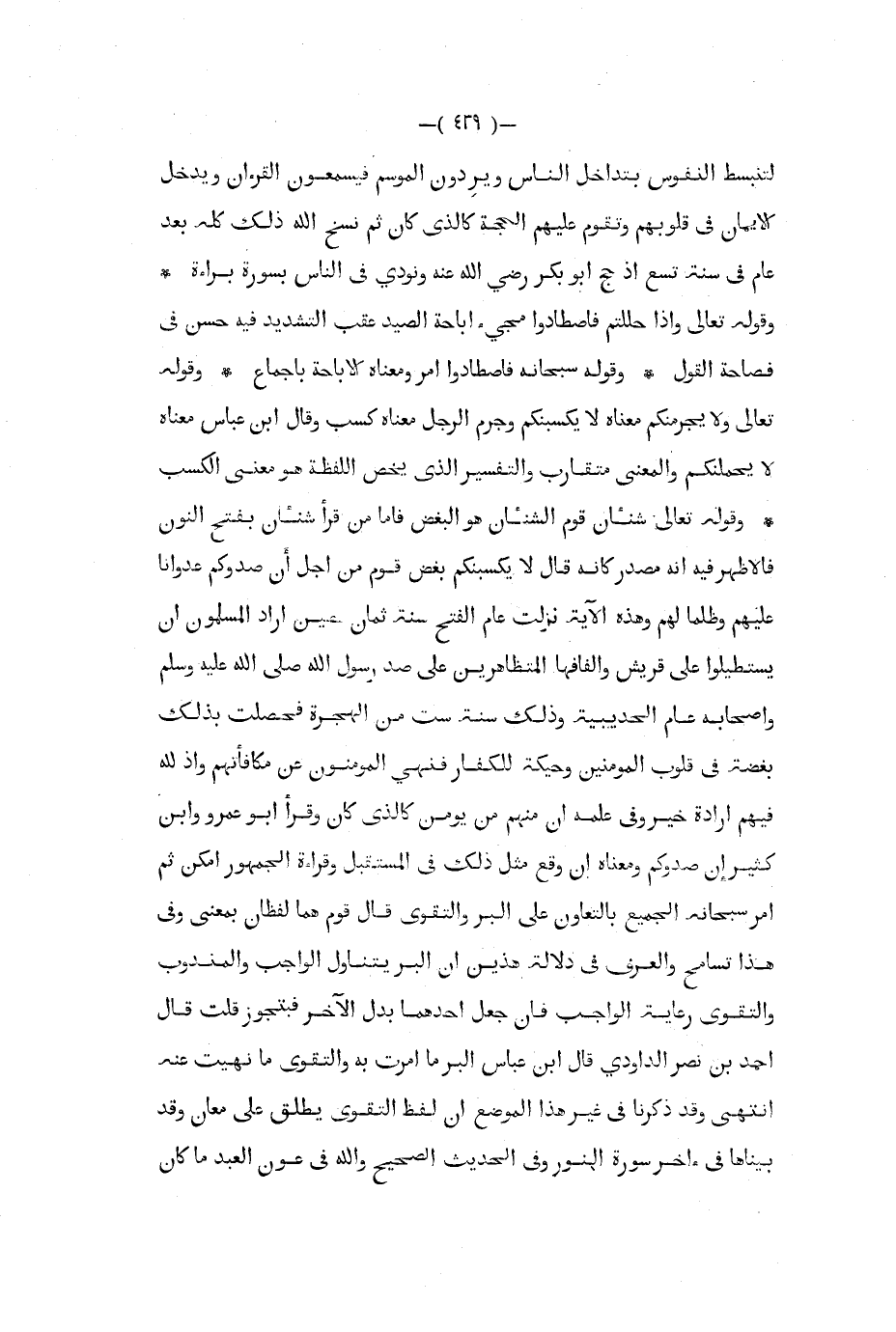 لتنبسط النفوس بتداخل الناس ويردون الموسم فيسمعون القرآن ويدخل الإيمان في قلوبهم وتقوم عليهم الحجة كالذي كان ثم نسخ الله ذلك كله بعد عام في سنة تسع إذ حج أبو بكر رضي الله عنه ونودي في الناس بسورة براءة وقوله تعالى وإذا حللتم فاصطادوا مجيء إباحة الصيد عقب التشديد فيه حسن في فصاحة القول وقوله سبحانه فاصطادوا أمر ومعناه الإباحة بإجماع وقوله تعالى ولا يجرمنكم معناه لا يكسبنكم وجرم الرجل معناه كسب وقال ابن عباس معناه لا يحملنكم والمعنى متقارب والتفسير الذي يخص اللفظة هو معنى الكسب وقوله تعالى شنئان قوم الشنئان هو البغض فأما من قرا شنئان بفتح النون فالأظهر فيه أنه مصدر كأنه قال لا يكسبنكم بغض قوم من أجل أن صدوكم عدوانا عليهم وظلما لهم وهذه الآية نزلت عام الفتح سنة ثمان حين أراد المسلمون أن يستطيلوا علىقريش والفافها المتظاهرين على صد رسول الله صلى الله عليه و سلم وأصحابه عام الحديبية وذلك سنة ست من الهجرة فحصلت بذلك بغضة في قلوب المؤمنين وحيكة للكفار فنهي المؤمنون عن مكافأتهم وإذ لله فيهم إرادة خير وفي علمه أن منهم من يؤمن كالذي كان وقرأ أبو عمرو وابن كثير إن صدوكم ومعناه إن وقع مثل ذلك في المستقبل وقراءة الجمهور أمكن ثم أمر سبحانه الجميع بالتعاون على البر والتقوى قال قوم هما لفظان بمعنى وفي هذا تسامح والعرف في دلالة هذين أن البر يتناول الواجب والمندوب والتقوى رعاية الواجب فإن جعل أحدهما بدل الآخر فبتجوز قلت قال أحمد بن نصر الداودي قال ابن عباس البر ما أمرت به والتقوى ما نهيت عنه انتهى وقد ذكرنا في غير هذا الموضع أن لفظ التقوى يطلق على معان وقد بيناها في آخر سورة النور وفي الحديث الصحيح والله في عون العبد ما كان العبد