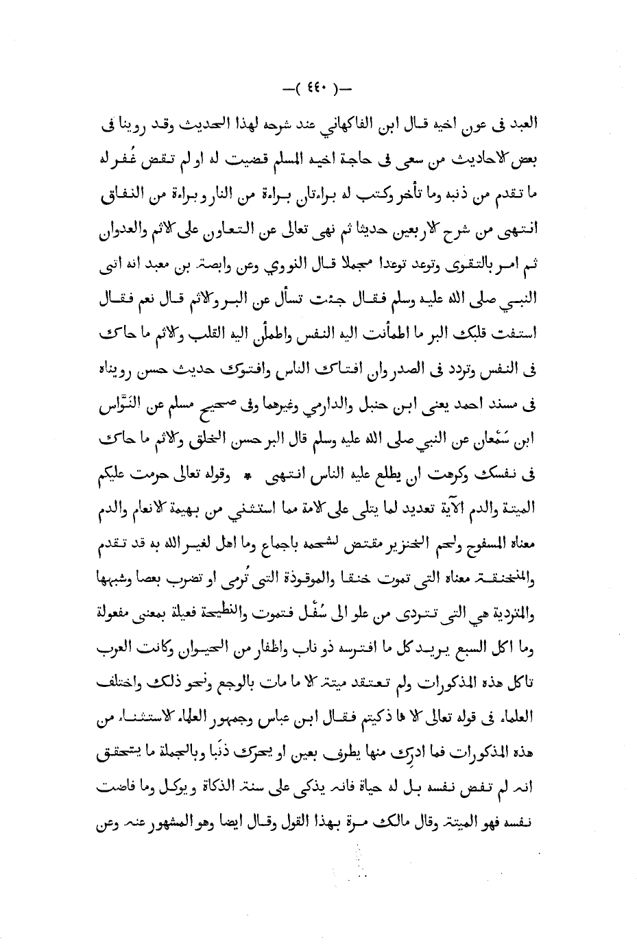 في عون أخيه قال ابن الفاكهاني عند شرحه لهذا الحديث وقد روينا في بعض الأحاديث من سعى في حاجة أخيه المسلم قضيت له أو لم تقض غفر له ما تقدم من ذنبه وما تأخر وكتب له براءتان براءة من النار وبراءة من النفاق انتهى من شرح الأربعين حديثا ثم نهى تعالى عن التعاون على الإثم والعدوان ثم أمر بالتقوى وتوعد توعدا مجملا قال النووي وعن وابصة بن معبد أنه أتى النبي صلى الله عليه و سلم فقال جئت تسأل عن البر والإثم قال نعم فقال استفت قلبك البر ما اطمأنت إليه النفس واطمأن إليه القلب والإثم ما حاك في النفس وتردد في الصدر وإن أفتاك الناس وأفتوك حديث حسن رويناه في مسند أحمد يعني أبن حنبل والدارمي وغيرهما وفي صحيح مسلم عن النواس ابن سمعان عن النبي صلى الله عليه و سلم قال البر حسن الخلق والإثم ماحاك في نفسك وكرهت أن يطلع عليه الناس انتهى وقوله تعالى حرمت عليكم الميتة والدم الآية تعديد لما يتلى على الأمة مما استثني من بهيمة الأنعام والدم معناه المسفوح ولحم الخنزير مقتض لشحمه بإجماع وما أهل لغير الله به قد تقدم والمنخنقة معناه التي تموت خنقا والموقوذة التي ترمى أو تضرب بعصا وشبهها والمتردية هي التي تتردى من علو إلى سفل تموت والنطيحة فعيله بمعنى مفعولة وما أكل السبع يريد كل ما افترسه ذو ناب وأظفار من الحيوان وكانت العرب تأكل هذه المذكورات ولم تعتقد ميتة إلا ما مات بالوجع ونحو ذلك واختلف العلماء في قوله تعالى إلا ما ذكيتم فقال ابن عباس وجمهور العلماء الاستثناء من هذه المذكورات فما أدرك منها يطرف بعين أو يحرك ذنبا وبالجملة ما يتحقق أنه لم تفض نفسه بل له حياة فإنه يذكى على سنة الذكاة ويؤكل وما فاضت نفسه فهو الميتة وقال مالك مرة بهذا القول وقال أيضا وهو المشهور عنه وعن