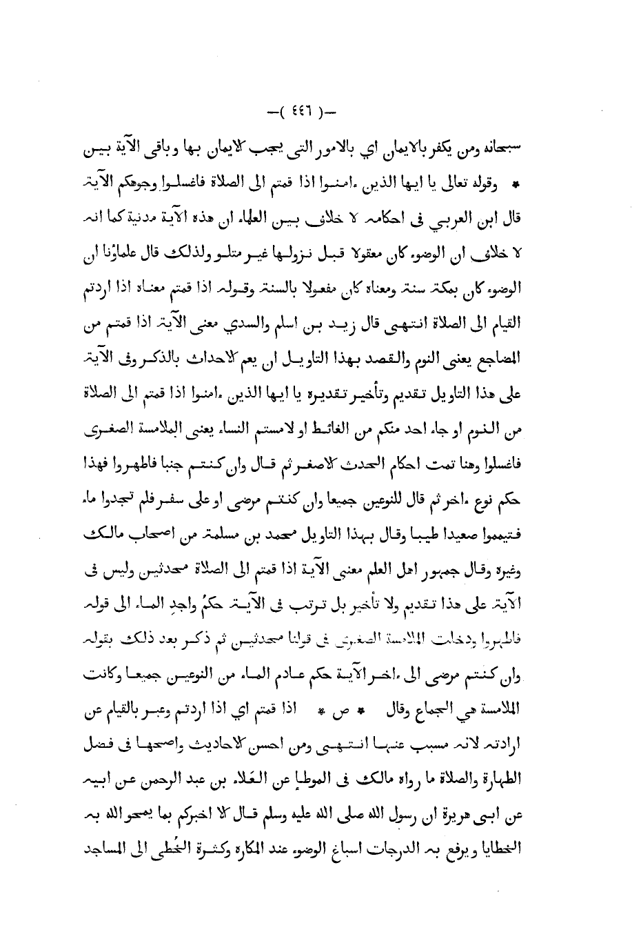 سبحانه ومن يكفر بالإيمان أي بالأمور التي يجب الإيمان بها وباقي الآية بين وقوله تعالى يا أيها الذين ءامنوا إذا قمتم إلى الصلاة فاغسلوا وجوهكم الآية قال ابن العربي في أحكامه لا خلاف بين العلماء أن هذه الآية مدنية كما أنه لا خلاف أن الوضوء كان معقولا قبل نزولها غير متلو ولذلك قال علماؤنا أن الوضوء كان بمكة سنة ومعناه كان مفعولا بالسنة وقوله إذا قمتم معناه إذا أردتم القيام إلى الصلاة انتهى قال زيد بن أسلم والسدي معنى الآية إذا قمتم من المضاجع يعني النوم والقصد بهذا التأويل أن يعم الأحداث بالذكر وفي الآية على هذا التأويل تقديم وتأخير تقديره يا أيها الذين آمنوا إذا قمتم إلى الصلاة من النوم أو جاء أحد منكم من الغائط أو لامستم النساء يعنى الملامسة الصغرى فاغسلوا وهنا تمت أحكام الحدث الأصغر ثم قال وإن كنتم جنبا فاطهروا فهذا حكم نوع أخر ثم قال للنوعين جميعا وإن كنتم مرضى أو على سفر فلم تجدوا ماء فتيمموا صعيدا طيبا وقال بهذا التأويل محمد بن مسلمة من أصحاب مالك وغيره وقال جمهور أهل العلم معنى الآية إذا قمتم إلى الصلاة محدثين وليس في الآية على هذا تقديم ولا تأخير بل ترتب في الآية حكم واجد الماء إلى قوله فاطهروا ودخلت الملامسة الصغرى في قولنا محدثين ثم ذكر بعد ذلك بقوله وإن كنتم مرضى إلى أخر الآية حكم عادم الماء من النوعين جميعا وكانت الملامسة هي الجماع وقال ص إذا قمتم أي إذا اردتم وعبر بالقيام عن إرادته لأنه مسبب عنها انتهى ومن احسن الأحاديث واصحها في فضل الطهارة والصلاة ما رواه مالك في الموطأ عن العلاء بن عبد الرحمن عن أبيه عن أبي هريرة أن رسول الله صلى الله عليه و سلم قال إلا أخبركم بما يمحوا الله به الخطايا ويرفع به الدرجات إسباغ الوضوء عند المكاره وكثرة الخطى إلى المساجد