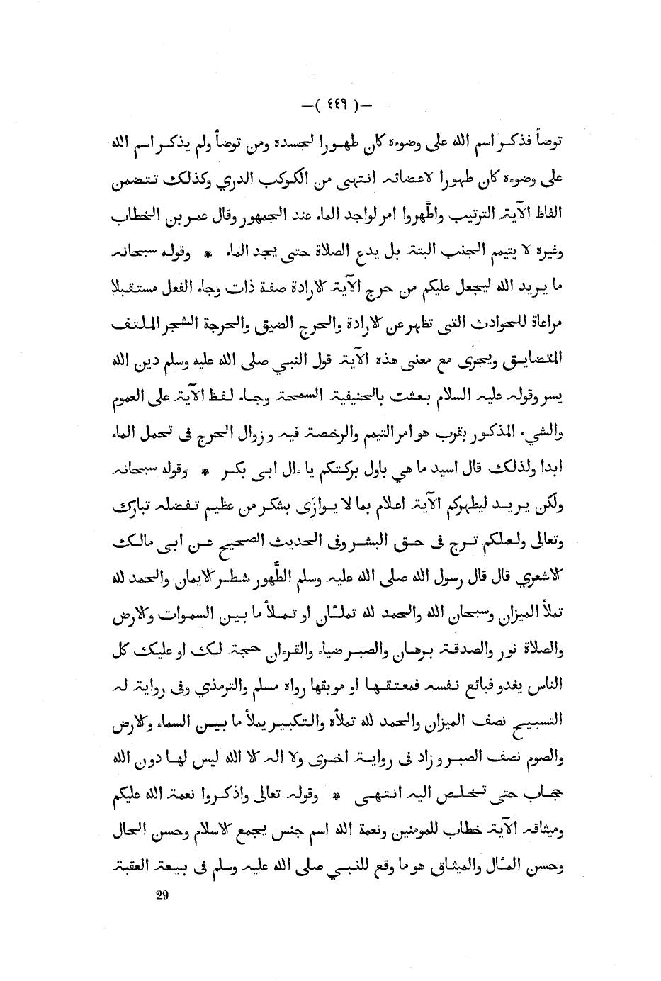توضأ فذكر اسم الله على وضوءه كان طهورا لجسده ومن توضأ ولم يذكر اسم الله على وضوءه كان طهورا لأعضائه انتهى من الكوكب الدري وكذلك تتضمن ألفاظ الآية الترتيب واطهروا أمر لواجد الماء عند الجمهور وقال عمر بن الخطاب وغيره لا يتيمم الجنب البتة بل يدع الصلاة حتى يجد الماء وقوله سبحانه ما يريد الله ليجعل عليكم من حرج الآية الإرادة صفة ذات وجاء الفعل مستقبلا مراعاة للحوادث التي تظهر عن الإرادة والحرج الضيق والحرجة الشجر الملتف المتضايق ويجرى مع معنى هذه الآية قول النبي صلى الله عليه و سلم دين الله يسر وقوله عليه السلام بعثت بالحنيفية السمحة وجاء لفظ الآية على العموم والشيء المذكور بقرب هوأمر التيمم والرخصة فيه وزوال الحرج في تحمل الماء ابدا ولذلك قال أسيد ما هي بأول بركتكم يا آل أبي بكر وقوله سبحانه ولكن يريد ليظهركم الآية إعلام بما لا يوازي بشكر من عظيم تفضله تبارك وتعالى ولعلكم ترج في حق البشر وفي الحديث الصحيح عن أبي مالك الأشعري قال قال رسول الله صلى الله عليه و سلم الطهور شطر الإيمان والحمد لله تملأ الميزان وسبحان الله والحمد لله تملئان أو تملأ ما بين السماوات والأرض والصلاة نور والصدقة برهان والصبر ضياء والقرآن حجة لك أو عليك كل الناس يغدو فبائع نفسه فمعتقها أو موبقها رواه مسلم والترمذي وفي رواية له التسبيح نصف الميزان والحمد لله تملأه والتكبير يملأ ما بين السماء والأرض والصوم نصف الصبر وزاد في رواية أخرى ولا إله إلا الله ليس لها دون الله حجاب حتى تخلص إليه انتهى وقوله تعالى واذكروا نعمة الله عليكم وميثاقه الآية خطاب للمؤمنين ونعمة الله اسم جنس يجمع الإسلام وحسن الحال وحسن المئال والميثاق هو ما وقع للنبي صلى الله عليه و سلم في بيعة العقبة