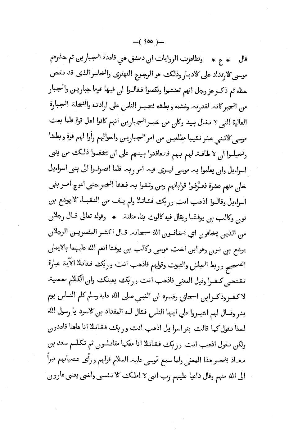 قال ع وتظاهرت الروايات أن دمشق هي قاعدة الجبارين ثم حذرهم موسى الارتداد على الأدبار وذلك هو الرجوع القهقري والخاسر الذي قد نقص حظه ثم ذكر عز و جل أنهم تعنتوا ونكصوا فقالوا إن فيها قوما جبارين والجبار من الجبر كأنه لقدرته وغشمه وبطشه يجبر الناس على إرادته والنخلة الجبارة العالية التي لا تنال بيد وكان من خبر الجبارين أنهم كانوا أهل قوة فلما بعث موسى الاثني عشر نقيبا مطلعين من امر الجبارين واحوالهم رأوا لهم قوة وبطشا وتخيلوا أن لا طاقة لهم بهم فتعاقدوا بينهم على أن يخفوا ذلك من بني إسرائيل وأن يعلموا به موسى ليرى فيه أمر ربه لما أنصرفوا إلى بني إسرائيل خان منهم عشرة فعرفوا قراباتهم ومن وثقوا به ففشا الخبر حتى أعوج أمر بني إسرائيل وقالوا أذهب أنت وربك فقاتلا ولم يف من النقباء إلا يوشع بن نون وكالب بن يوفتا ويقال فيه كالوث بثاء مثلثة وقوله تعالى قال رجلان من الذين يخافون أي يخافون الله سبحانه قال أكثر المفسرين الرجلان يوشع بن نون وهو ابن أخت موسى وكالب بن يوفتا أنعم الله عليهما بالإيمان الصحيح وربط الجأش والثبوت وقولهم فاذهب أنت وربك فقاتلا الآية عبارة تقتضي كفرا وقيل المعنى فاذهب أنت وربك يعينك وأن الكلام معصية لا كفر وذكر ابن إسحاق وغيره أن النبي صلى الله عليه و سلم كلم الناس يوم بدر وقال لهم أشيروا علي أيها الناس فقال له المقداد بن الأسود يا رسول الله لسنا نقول كما قالت بنو إسرائيل اذهب أنت وربك فقاتلا انا هاهنا قاعدون ولكن نقول اذهب أنت وربك فقاتلا انا معكما مقاتلون ثم تكلم سعد بن معاذ بنحو هذا المعنى ولما سمع موسى عليه السلام قولهم ورأى عصيانهم تبرأ إلى الله منهم قوال داعيا عليهم رب إني لا أملك إلا نفسي وأخي يعني هارون