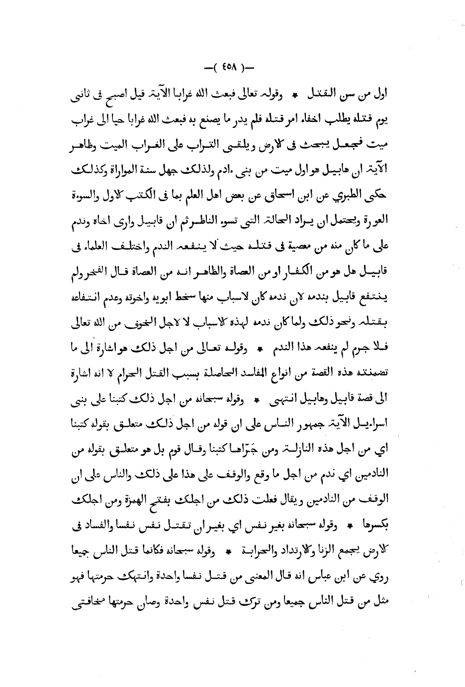 أول من سن القتل وقوله تعالى فبعث الله غرابا الآية قيل أصبح في ثاني يوم قتله يطلب اخفاء أمر قتله فلم يدر ما يصنع به فبعث الله غرابا حيا إلى غراب ميت فجعل يبحث في الأرض ويلقي التراب على الغراب الميت وظاهر الآية أن هابيل هو أول ميت من بني آدم ولذلك جهل سنة المواراة وكذلك حكى الطبري عن ابن إسحاق عن بعض أهل العلم بما في الكتب الأول والسوءة العورة ويحتمل أن يراد الحالة التي تسوء الناظر ثم أن قابيل وارى أخاه وندم على ما كان منه من معصية في قتله حيث لا ينفعه الندم واختلف العلماء في قابيل هل هو من الكفار أو من العصاة والظاهر أنه من العصاة قال الفخر ولم ينتفع قابيل بندمه لأن ندمه كان لأسباب منها سخط أبويه واخوته وعدم انتفاعه بقتله ونحو ذلك ولما كان ندمه لهذه الأسباب لا لأجل الخوف من الله تعالى فلا جرم لم ينفعه هذا الندم وقوله تعالى من أجل ذلك هو إشارة إلى ما تضمنته هذه القصة من أنواع المفاسد الحاصلة بسبب القتل الحرام لا أنه إشارة إلى قصة قابيل وهابيل انتهى وقوله سبحانه من أجل ذلك كتبنا على بني إسرائيل الآية جمهور الناس على أن قوله من أجل ذلك متعلق بقوله كتبنا أي من أجل هذه النازلة ومن جراها كتبنا وقال قوم بل هو متعلق بقوله من النادمين أي ندم من أجل ما وقع والوقف على هذا على ذلك والناس على أن الوقف من النادمين ويقال فعلمت ذلك من أجلك بفتح الهمزة ومن أجلك بكسرها وقوله سبحانه بغير نفس أي بغير أن تقتل نفس نفسا والفساد في الأرض يجمع الزنا والارتداد والحرابة وقوله سبحانه فكأنما قتل الناس جميعا روي عن ابن عباس أنه قال المعنى من قتل نفسا واحدة وانتهك حرمتها فهو مثل من قتل الناس جميعا ومن ترك قتل نفس واحدة وصان حرمتها مخافتي