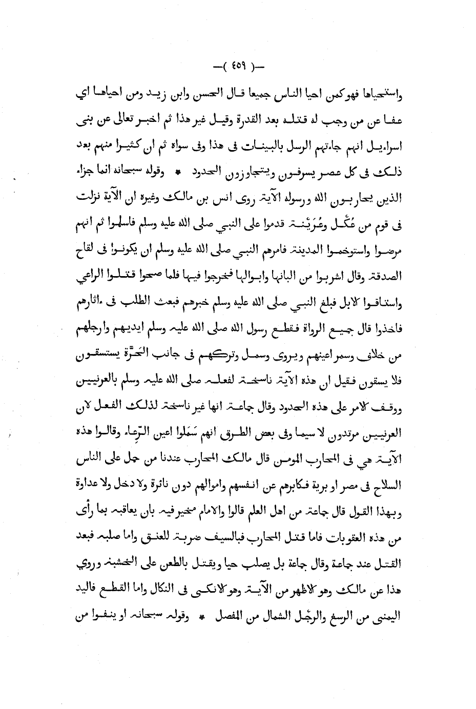 واستحياها فهو كمن أحيا الناس جميعا قال الحسن وابن زيد ومن أحياها أي عفا عن من وجب له قتله بعد القدرة وقيل غير هذا ثم أخبر تعالى عن بني إسرائيل أنهم جاءتهم الرسل بالبينات في هذا وفي سواه ثم أن كثيرا منهم بعد ذلك في كل عصر يسرفون ويتجاوزون الحدود وقوله سبحانه إنما جزاء الذين يحاربون الله ورسوله الآية روى أنس بن مالك وغيره أن الآية نزلت في قوم من عكل وعرينة قدموا على النبي صلى الله عليه و سلم فاسلموا ثم انهم مرضوا واستوخموا المدينة فامرهم النبي ص - أن يكونوا في لقاح الصدقة وقال اشربوا من ألبانها وأبوالها فخرجوا فيها فلما صحوا قتلوا الراعي واستاقوا الإبل فبلغ النبي صلى الله عليه و سلم خبرهم فبعث الطلب في آثارهم فأخذوا قال جميع الرواة فقطع رسول الله صلى الله عليه و سلم أيديهم وأرجلهم من خلاف وسمر أعينهم ويروى وسمل وتركهم في جانب الحرة يستسقون فلا يسقون فقيل أن هذه الآية ناسخة لفعله صلى الله عليه و سلم بالعرنيين ووقف الأمر على هذه الحدود وقال جماعة أنها غير ناسخة لذلك الفعل لأن العرنيين مرتدون لا سيما وفي بعض الطرق أنهم سملوا أعين الرعاء وقالوا هذه الآية هي في المحارب المؤمن قال مالك المحارب عندنا من حمل على الناس السلاح في مصر أو برية فكابرهم عن أنفسهم وأموالهم دون نائرة ولا دخل ولا عداوة وبهذا القول قال جماعة من أهل العلم قالوا والإمام مخير فيه بأن يعاقبه بما رأى من هذه العقوبات فأما قتل المحارب فبالسيف ضربة للعنق وأما صلبه فبعد القتل عند جماعة وقال جماعة بل يصلب حيا ويقتل بالطعن على الخشبة وروي هذا عن مالك وهو الأظهر من الآية وهو الأنكى في النكال وأما القطع فاليد اليمنى من الرسغ والرجل الشمال من المفصل وقوله سبحانه أو ينفوا من