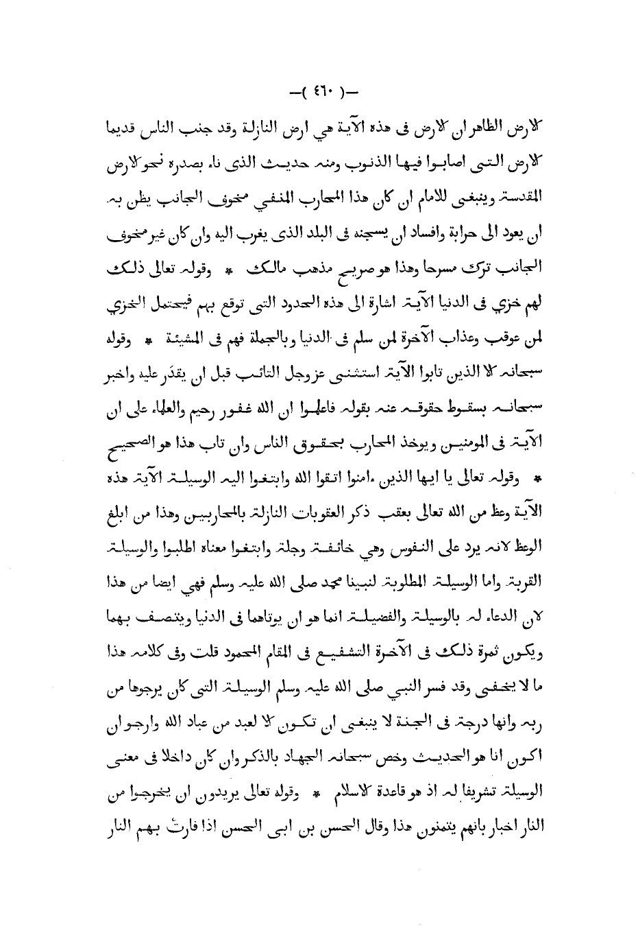 الأرض الظاهر أن الأرض في هذه الآية هي أرض النازلة وقد جنب الناس قديما الأرض التي أصابوا فيها الذنوب ومنه حديث الذي ناء بصدره نحو الأرض المقدسة وينبغي للإمام إن كان هذا المحارب المنفي مخوف الجانب يظن به أن يعود إلى حرابه وافساد أن يسجنه في البلد الذي يغرب إليه وإن كان غير مخوف الجانب ترك مسرحا وهذا هو صريح مذهب مالك وقوله تعالى ذلك لهم خزي في الدنيا الآية إشارة إلى هذه الحدود التي توقع بهم فيحتمل الخزي لمن عوقب وعذاب الآخرة لمن سلم في الدنيا وبالجملة فهم في المشيئة وقوله سبحانه إلا الذين تابوا الآية استثنى عز و جل التائب قبل أن يقدر عليه وأخبر سبحانه بسقوط حقوقه عنه بقوله فأعلموا أن الله غفور رحيم والعلماء على أن الآية في المؤمنين ويؤخذ المحارب بحقوق الناس وإن تاب هذا هو الصحيح وقوله تعالى يا أيها الذين ءامنوا اتقوا الله وابتغوا إليه الوسيلة الآية هذه الآية وعظ من الله تعالى بعقب ذكر العقوبات النازلة بالمحاربين وهذا من أبلغ الوعظ لأنه يرد على النفوس وهي خائفة وجلة وابتغوا معناه اطلبوا والوسيلة القربة وأما الوسيلة المطلوبة لنبينا محمد صلى الله عليه و سلم فهي أيضا من هذا لأن الدعاء له بالوسيلة والفضيلة إنما هو أن يؤتاهما في الدنيا ويتصف بهما ويكون ثمرة ذلك في الآخرة التشفيع في المقام المحمود قلت وفي كلامه هذا مالا يخفى وقد فسر النبي صلى الله عليه و سلم الوسيلة التي كان يرجوها من ربه وأنها درجة في الجنة لا ينبغي أن تكون إلا لعبد من عباد الله وأرجو أن أكون أنا هو الحديث وخص سبحانه الجهاد بالذكر وإن كان داخلا في معنى الوسيلة تشريفا له إذ هو قاعدة الإسلام وقوله تعالى يريدون أن يخرجوا من النار إخبار بأنهم يتمنون هذا وقال الحسن بن أبي الحسن إذا فارت بهم النار