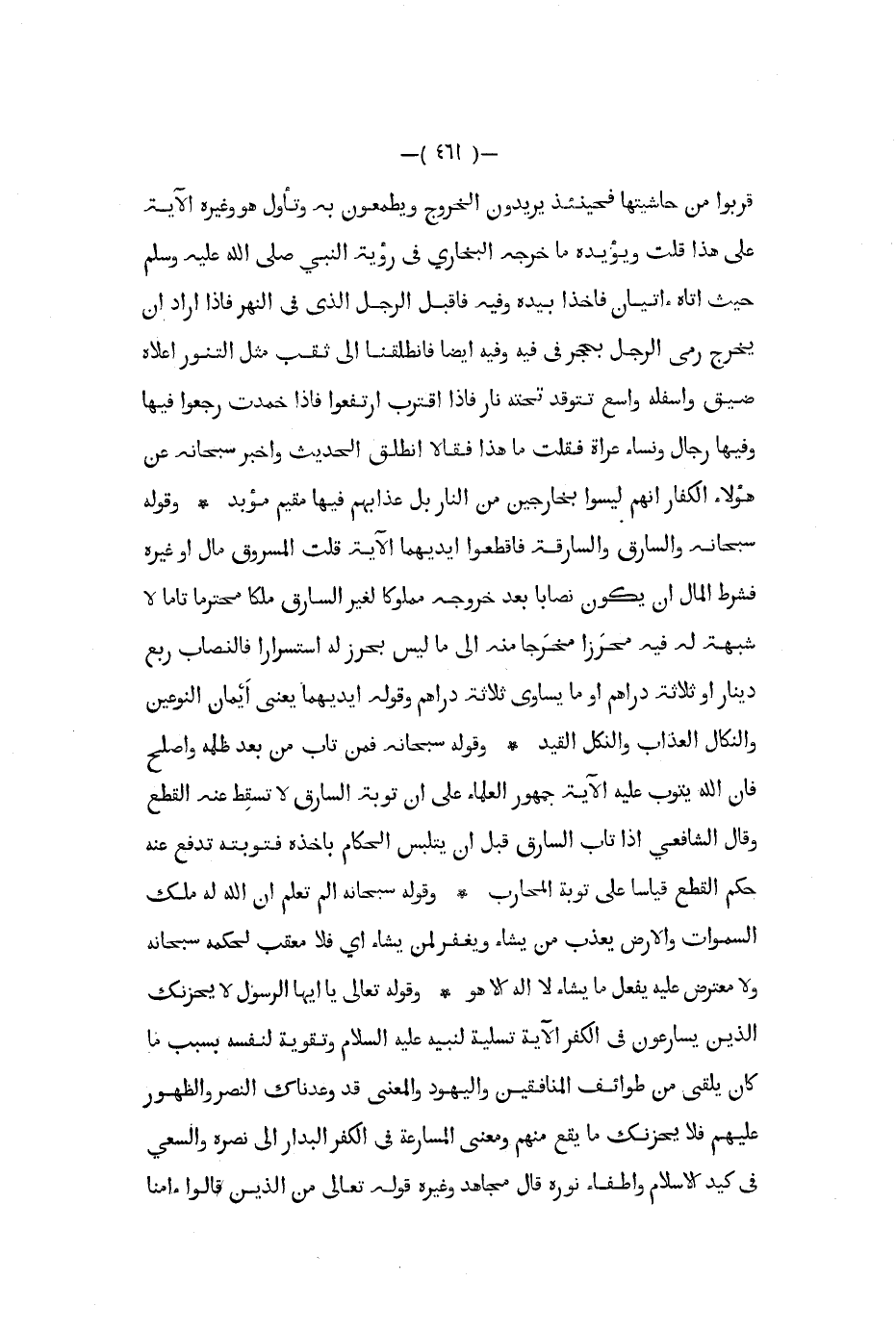قربوا من حاشيتها فحينئذ يريدون الخروج ويطمعون به وتأول هو وغيره الآية على هذا قلت ويؤيده ما خرجه البخاري في رؤية النبي صلى الله عليه و سلم حيث أتاه ءاتيان فأخذا بيده وفيه فأقبل الرجل الذي في النهر فإذا أراد أن يخرج رمى الرجل بحجر في فيه وفيه أيضا فانطلقنا إلى ثقب مثل التنور أعلاه ضيق وأسفله وساع تتوقد تحته نار فإذا اقترب ارتفعوا فإذا خمدت رجعوا فيها وفيها رجال نساء عراة فقلت ما هذا فقالا أنطلق الحديث وأخبر سبحانه عن هؤلاء الكفار أنهم ليسوا بخارجين من النار بل عذابهم فيها مقيم مؤبد وقوله سبحانه والسارق والسارقة فاقطعوا أيديهما الآية قلت المسروق مال أو غيره فشرط المال أن يكون نصابا بعد خروجه مملوكا لغير السارق ملكا محترما تاما لا شبهة له فيه محرزا مخرجا منه إلى ما ليس بحرز له استسرارا فالنصاب ربع دينار أو ثلاثة دراهم أو ما يساوي ثلاثة دراهم وقوله أيديهما يعني أيمان النوعين والنكال العذاب والنكل القيد وقوله سبحانه فمن تاب من بعد ظلمه وأصلح فإن الله يتوب عليه الآية جمهور العلماء على أن توبة السارق لا تسقط عنه القطع وقال الشافعي إذا تاب السارق قبل أن يتلبس الحكام بأخذه فتوبته تدفع عنه حكم القطع قياسا على توبة المحارب وقوله سبحانه ألم تعلم أن الله له ملك السموات والأرض يعذب من يشاء ويغفر لمن يشاء أي فلا معقب لحكمه سبحانه ولا معترض عليه يفعل ما يشاء لا إله إلا هو وقوله تعالى يا أيها الرسول لا يحزنك الذين يسارعون في الكفر الآية تسلية لنبيه عليه السلام وتقوية لنفسه بسبب ما كان يلقى من طوائف المنافقين واليهود والمعنى قد وعدناك النصر والظهور عليهم فلا يحزنك ما يقع منهم ومعنى المسارعة في الكفر البدار إلى نصره والسعي في كيد الإسلام وإطفاء نوره قال مجاهد وغيره قوله تعالى من الذين قالوا ءامنا