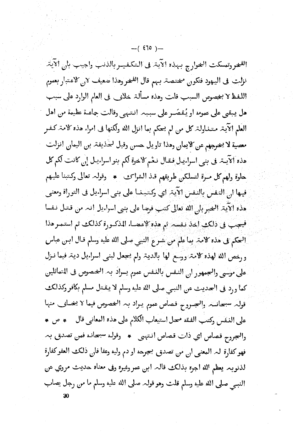الفخر وتمسكت الخوارج بهذه الآية في التكفير بالذنب وأجيب بأن الآية نزلت في اليهود فتكون مختصة بهم قال الفخر وهذا ضعيف لأن الاعتبار بعموم اللفظ لا بخصوص السبب قلت وهذه مسألة خلاف في العام الوارد على سبب هل يبقى على عمومه أو يقصر على سببه انتهى وقالت جماعة عظيمة من أهل العلم الآية متناولة كل من لم يحكم بما أنزل الله ولكنها في أمراء هذه الأمة كفر معصية لا يخرجهم عن الإيمان وهذا تأويل حسن وقيل لحذيفة بن اليمان أنزلت هذه الآية في بني إسرائيل فقال نعم الأخوة لكم بنو إسرائيل إن كانت لكم كل حلوة ولهم كل مرة لتسلكن طريقهم قذ الشراك وقوله تعالى وكتبنا عليهم فيها أن النفس بالنفس الآية أي وكتبنا على بني إسرائيل فى التوراة ومعنى هذه الآية الخبر بان الله تعالى كتب فرضا على بني اسرائيل أنه من قتل نفسا فيجب في ذلك أخذ نفسه ثم هذه الأعضاء المذكورة كذلك ثم استمر هذا الحكم في هذه الأمة بما علم من شرع النبي صلى الله عليه و سلم قال ابن عباس ورخص الله لهذه الأمة ووسع لها بالدية ولم يجعل لنبي إسرائيل دية فيما نزل على موسى والجمهور أن النفس بالنفس عموم يراد به الخصوص في المتماثلين كما ورد في الحديث عن النبي صلى الله عليه و سلم لا يقتل مسلم بكافر وكذلك قوله سبحانه والجروح قصاص عموم يراد به الخصوص فيما لا يخاف منها على النفس وكتب الفقه محل استيعاب الكلام على هذه المعاني قال ص والجروح قصاص أي ذات قصاص انتهى وقوله سبحانه فمن تصدق به فهو كفارة له المعنى أن من تصدق بجرحه أو دم وليه وعفا فإن ذلك العفو كفارة لذنوبه يعظم الله أجره بذلك قاله ابن عمر وغيره وفي معناه حديث مروي عن النبي صلى الله عليه و سلم قلت وهو قوله صلى الله عليه و سلم ما من رجل يصاب
