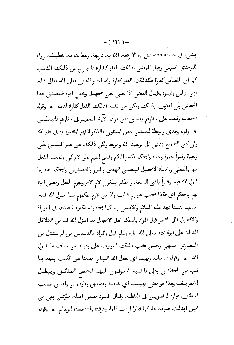 بشيء في جسده فتصدق به إلا رفعه الله به درجة وحط عنه به خطيئة رواه الترمذي انتهى وقيل المعنى فذلك العفو كفارة للجارح عن ذلك الذنب كما أن القصاص كفارة فكذلك العفو كفارة وأما أجر العافي فعلى الله تعالى قاله ابن عباس وغيره وقيل المعنى إذا جنى جان فجهل وخفي أمره فتصدق هذا الجاني بأن اعترف بذلك ومكن من نفسه فذلك الفعل كفارة لذنبه وقوله سبحانه وقفينا على ءاثارهم بعيسى ابن مريم الآية الضمير في آثارهم للنبيين وقوله وهدى وموعظة للمتقين خص المتقون بالذكر لأنهم المقصود به في علم الله وإن كان الجميع يدعى إلى توحيد الله ويوعظ ولكن ذلك على غير المتقين عمى وحيرة وقرأ حمزة وحده وليحكم بكسر اللام وفتح الميم على لام كي ونصب الفعل بها والمعنى وآتيناه الإنجيل ليتضمن الهدى والنور والتصديق وليحكم أهله بما أنزل الله فيه وقرأ باقي السبعة وليحكم بسكون لام الأمر وجزم الفعل ومعنى أمره لهم بالحكم أي هكذا يجب عليهم قلت وإذ من لازم حكمهم بما أنزل الله فيه اتباعهم لنبينا محمد عليه السلام والإيمان به كما يجدونه مكتوبا عندهم في التوراة والإنجيل قال الفخر قيل المراد وليحكم أهل الإنجيل بما أنزل الله فيه من الدلائل الدالة على نبوة محمد صلى الله عليه و سلم قيل والمراد بالفاسقين من لم يمتثل من النصارى انتهى وحسن عقب ذلك التوقيف على وعيد من خالف ما أنزل الله وقوله سبحانه ومهيمنا أي جعل الله القرآن مهيمنا على الكتب يشهد بما فيها من الحقائق وعلى ما نسبه المحرفون إليها فيصحح الحقائق ويبطل التحريف وهذا هو معنى مهيمنا أي شاهد ومصدق ومؤتمن وأمين حسب اختلاف عبارة المفسرين في اللفظة وقال المبرد مهيمن أصله مؤتمن بني من أمين أبدلت همزته هاء كما قالوا ارقت الماء وهرقته واستحسنه الزجاج وقوله