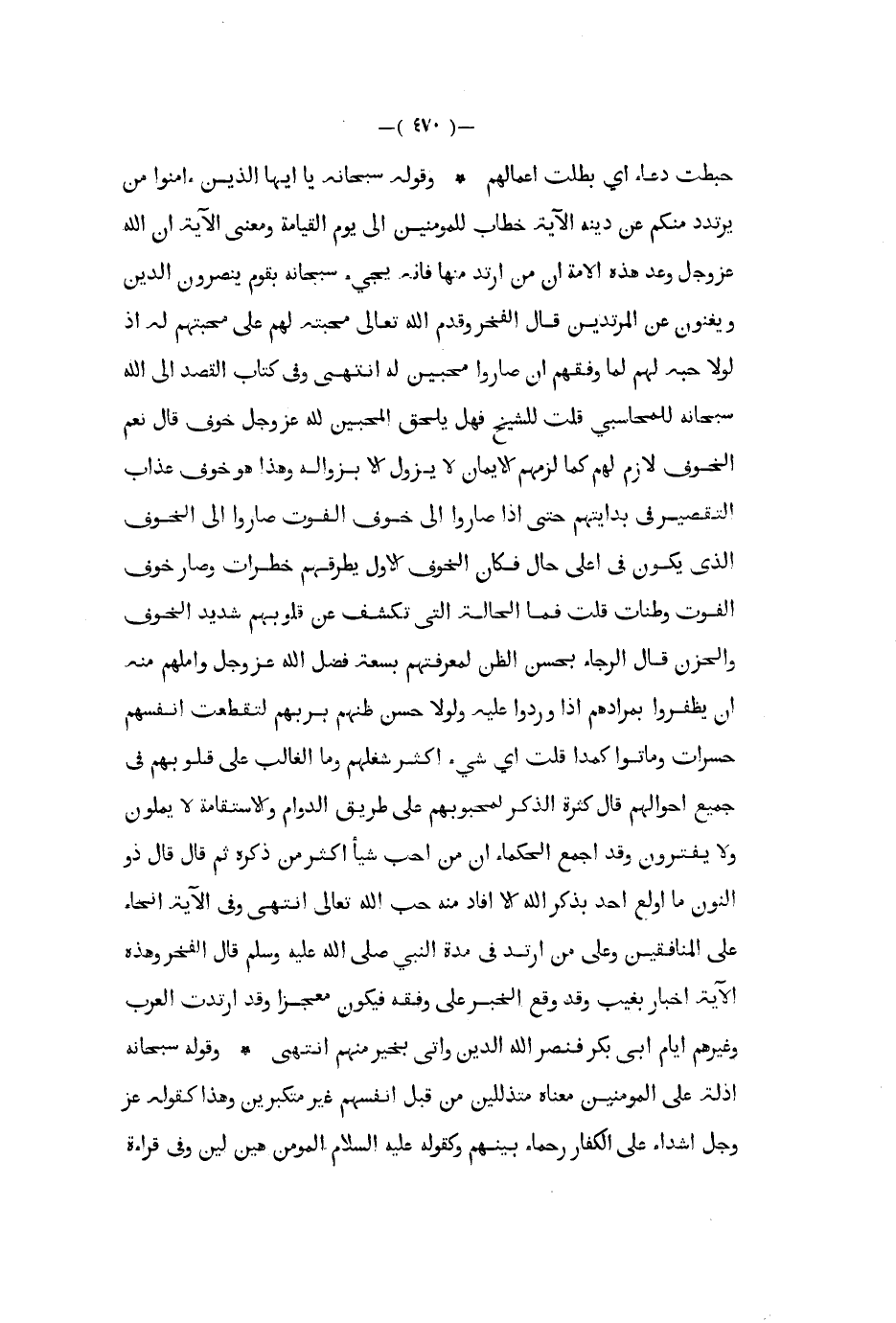 حبطت دعاء أي بطلت أعمالهم وقوله سبحانه يا أيها الذين ءامنوا من يرتدد منكم عن دينه الآية خطاب للمؤمنين إلى يوم القيامة ومعنى الآية إن الله عز و جل وعد هذه الأمة أن من أرتد منها فإنه يجيء سبحانه بقوم ينصرون الدين ويغنون عن المرتدين قال الفخر وقدم الله تعالى محبته لهم على محبتهم له إذ لولا حبه لهم لما وفقهم أن صاروا محبين له انتهى وفي كتاب القصد إلى الله سبحانه للمحاسبي قلت للشيخ فهل يلحق المحبين لله عز و جل خوف قال نعم الخوف لازم لهم كما لزمهم الإيمان لا يزول إلا بزواله وهذا هو خوف عذاب التقصير في بدايتهم حتى إذا صاروا إلى خوف الفوت صاروا إلى الخوف الذي يكون في أعلى حال فكان الخوف الأول يطرقهم خطرات وصار خوف الفوت وطنات قلت فما الحالة التي تكشف عن قلوبهم شديد الخوف والحزن قال الرجاء بحسن الظن لمعرفتهم بسعة فضل الله عز و جل وأملهم منه أن يظفروا بمرادهم إذا وردوا عليه ولولا حسن ظنهم بربهم لتقطعت أنفسهم حسرات وماتوا كمدا قلت أي شيء أكثر شغلهم وما الغالب على قلوبهم في جميع أحوالهم قال كثرة الذكر لمحبوبهم على طريق الدوام والاستقامة لا يملون ولا يفترون وقد أجمع الحكماء أن من أحب شيئا أكثر من ذكره ثم قال قال ذو النون ما اولع أحد بذكر الله إلا أفاد منه حب الله تعالى انتهى وفي الآية انحاء على المنافقين وعلى من ارتد في مدة النبي صلى الله عليه و سلم قال الفخر وهذه الآية إخبار بغيب وقد وقع الخبر على وفقه فيكون معجزا وقد ارتدت العرب وغيرهم أيام أبي بكر فنصر الله الدين وأتى بخير منهم انتهى وقوله سبحانه أذلة على المؤمنين معناه متذللين من قبل أنفسهم غير متكبرين وهذا كقوله عز و جل أشداء على الكفار رحماء بينهم وكقوله عليه السلام المؤمن هين لين وفي قراءة